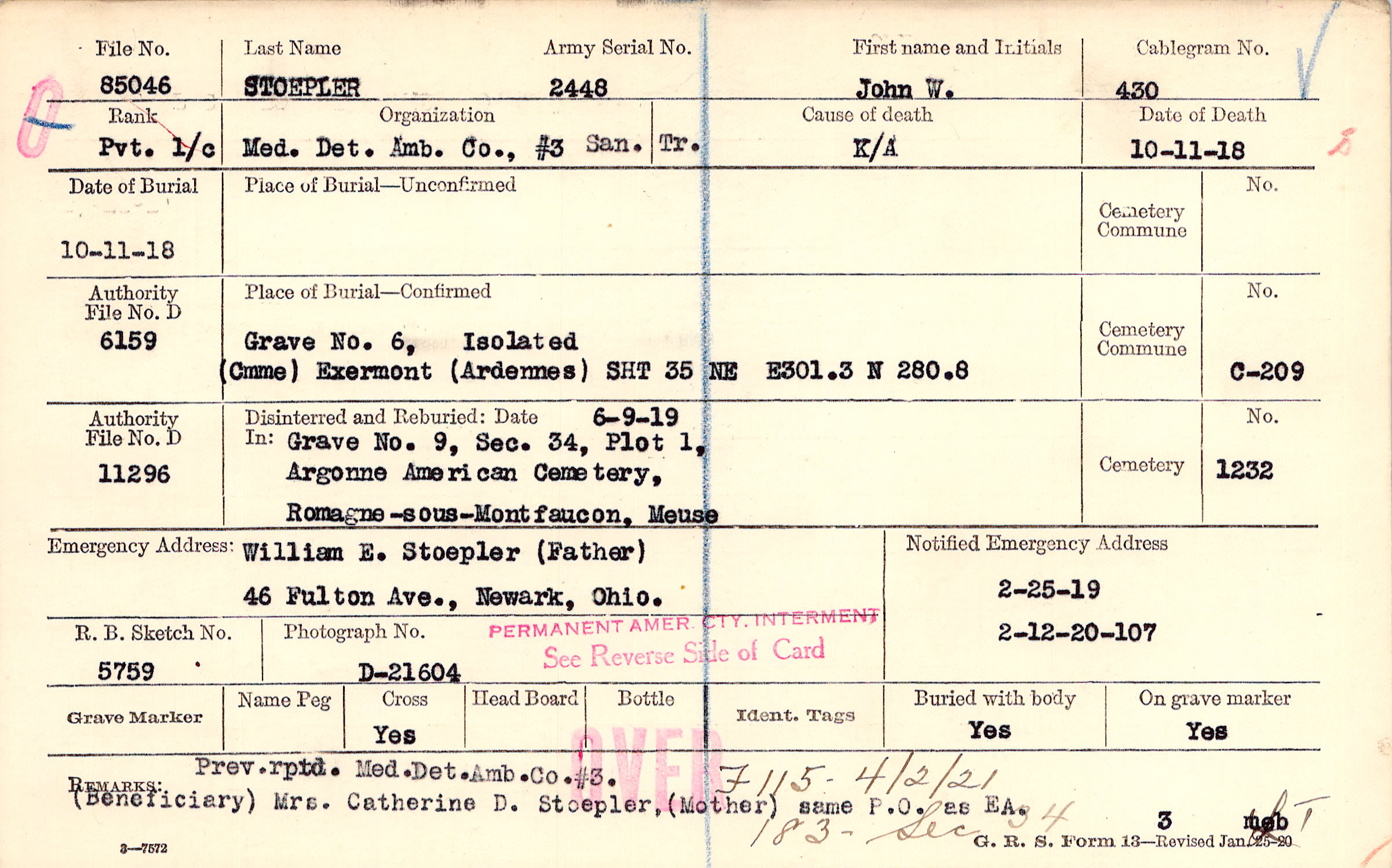 William E. Stoepler (Father), 46 Fulton Ave., Newark, Ohio.