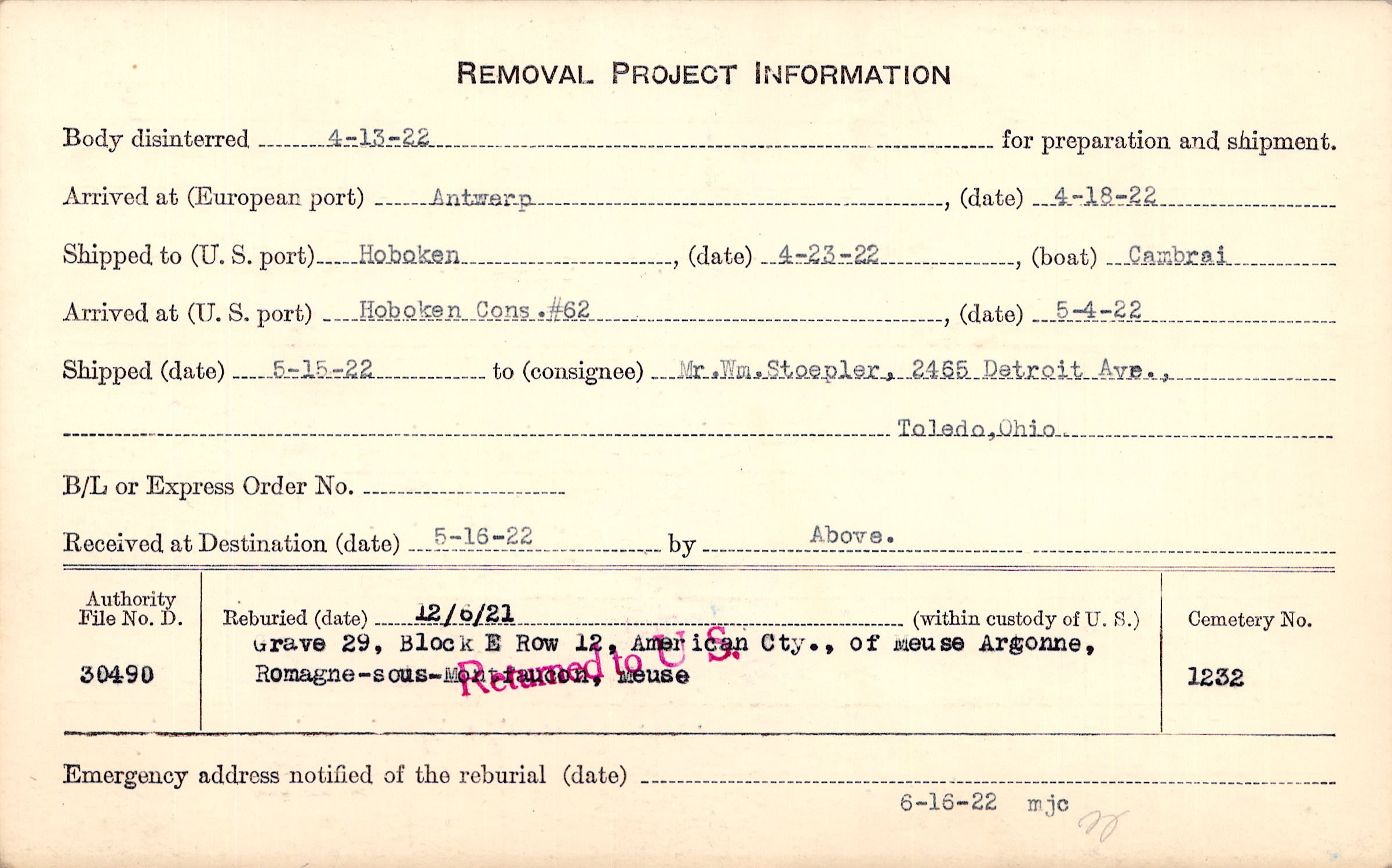 Body disinterred 4/13/1922 for preparation and shipment.