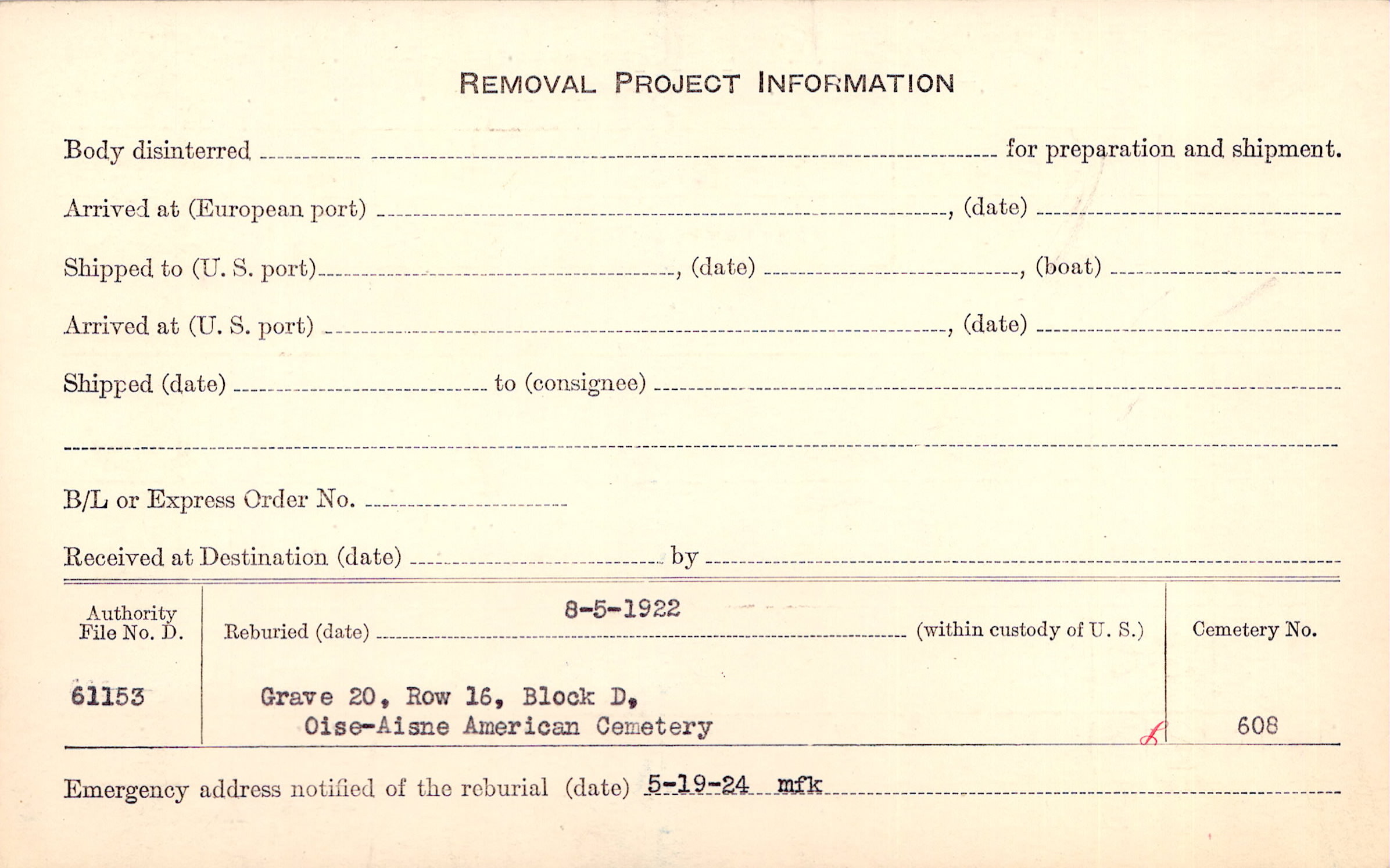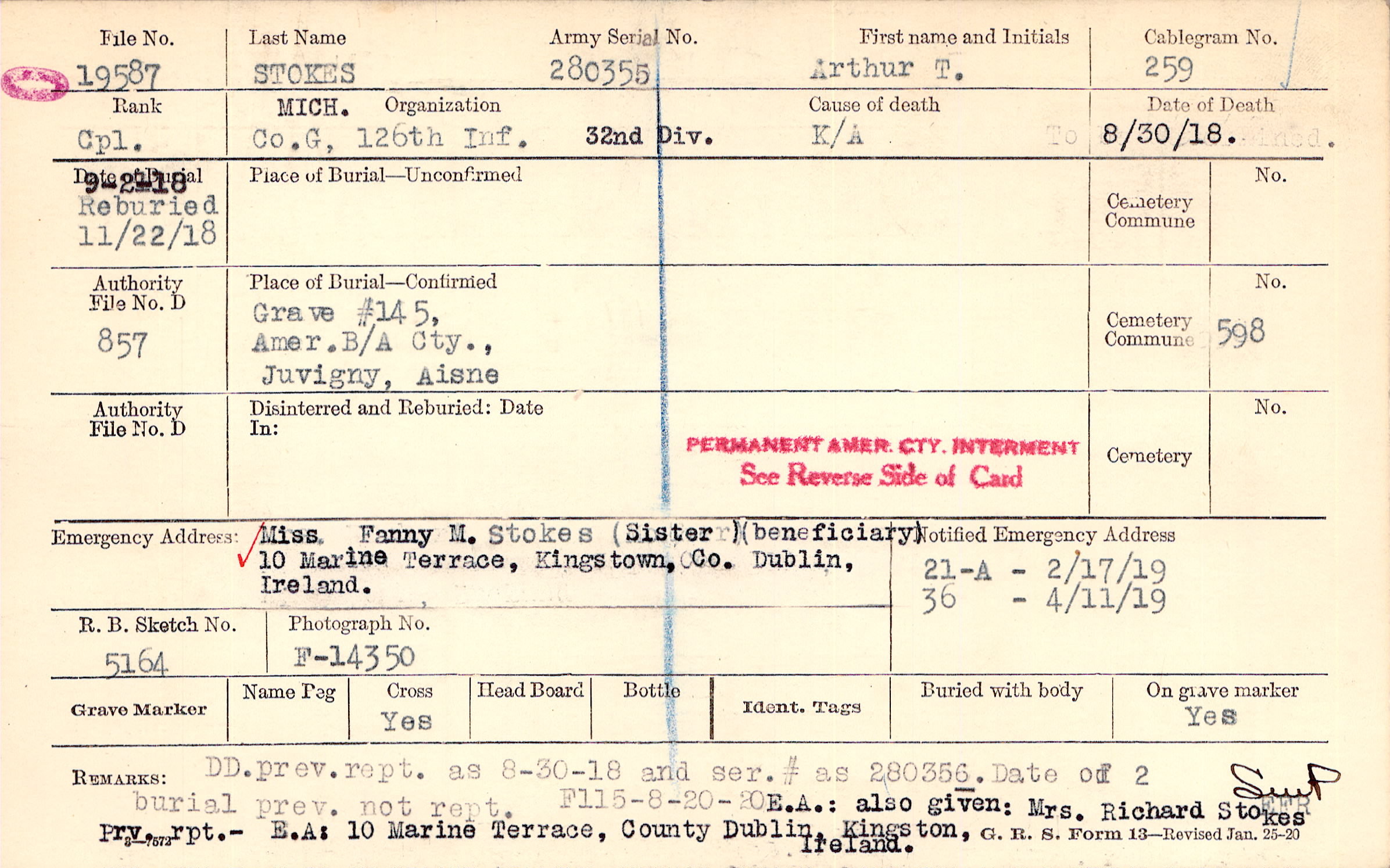 DD prev. rept. as 8-30-18 and ser. # as 280356. Date of 2 burial prev. not rept. E.A.: also given: Mrs. Richard Stokes. Prv. rpt.- E.A: 10 Marine Terrace, County Dublin, Kingston, Ireland., F115-8-20-20