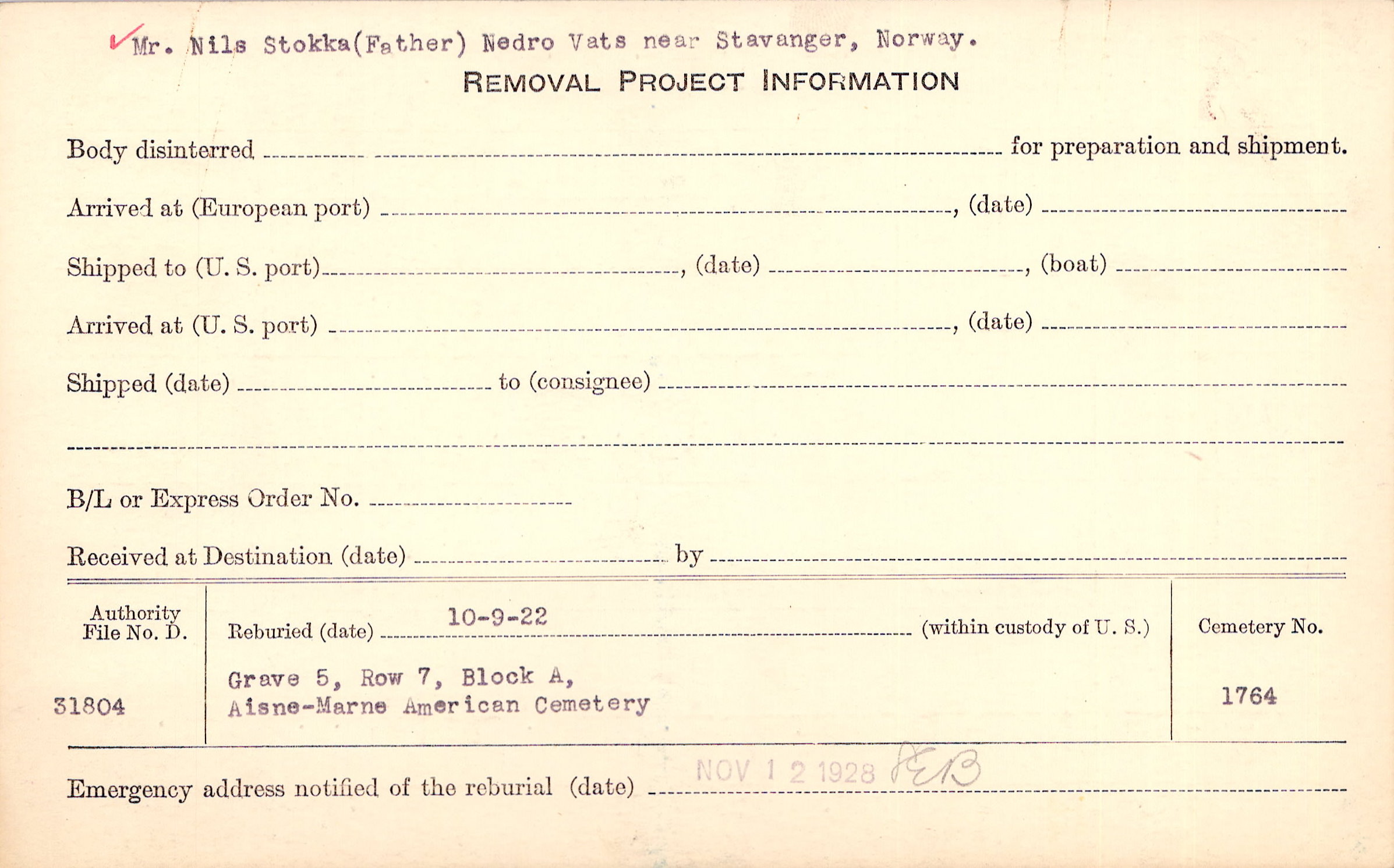 Mr. Nils Stokka (Father) Nedro Vats near Stavanger, Norway. |