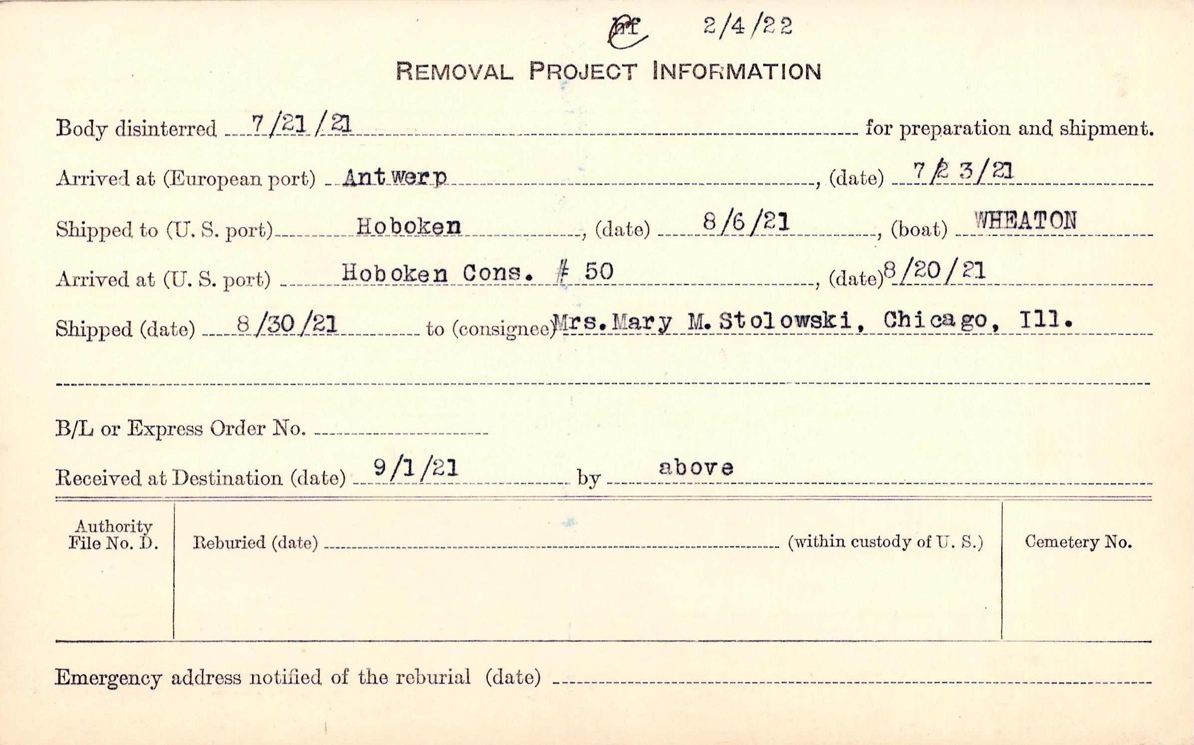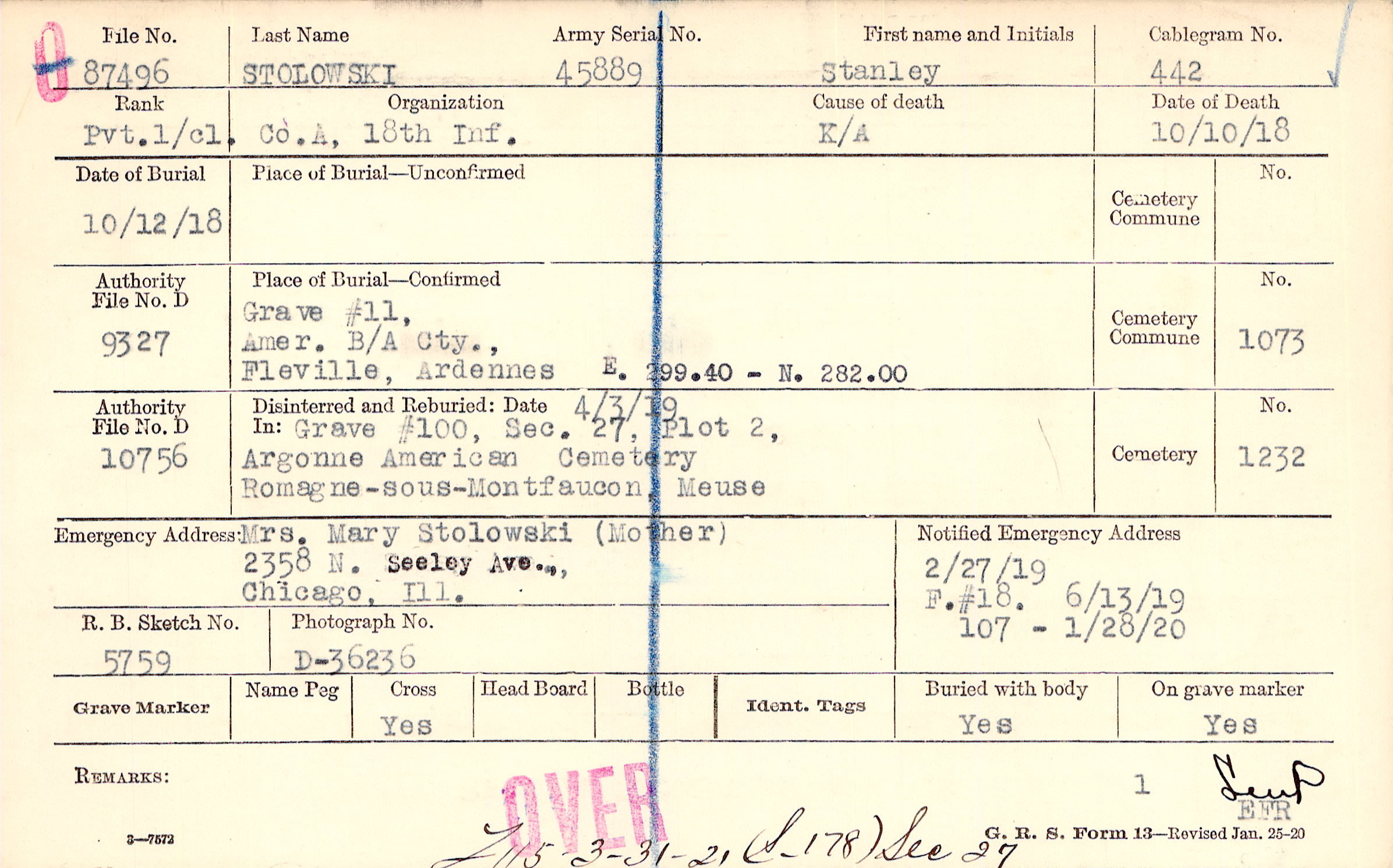 Mrs. Mary Stolowski (Mother), 2358 N. Seeley Ave., Chicago, Ill.