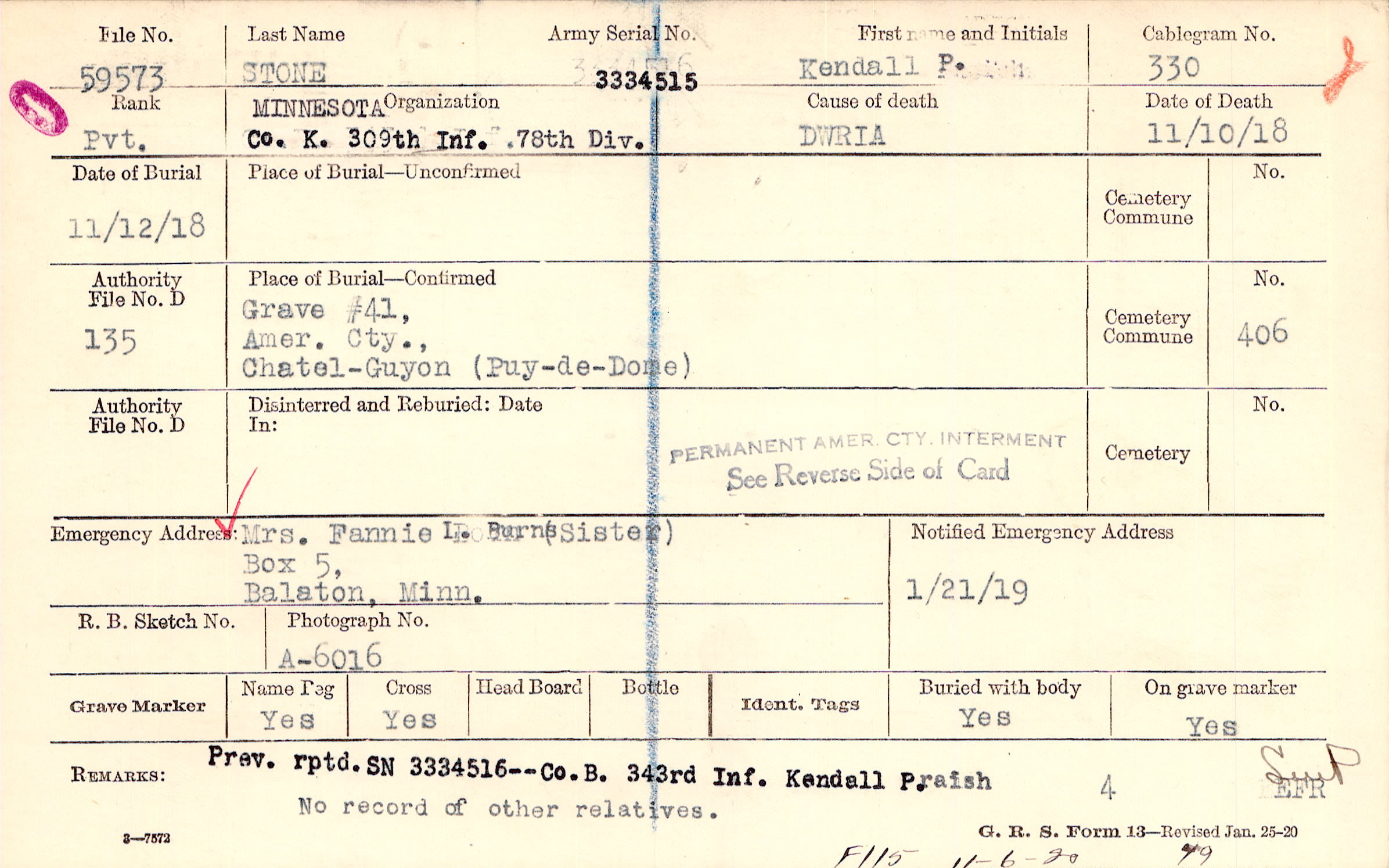 Prev. rptd. SN 3334516---Co.B. 343rd Inf. Kendall P. No record of other relatives., 11/6/1920