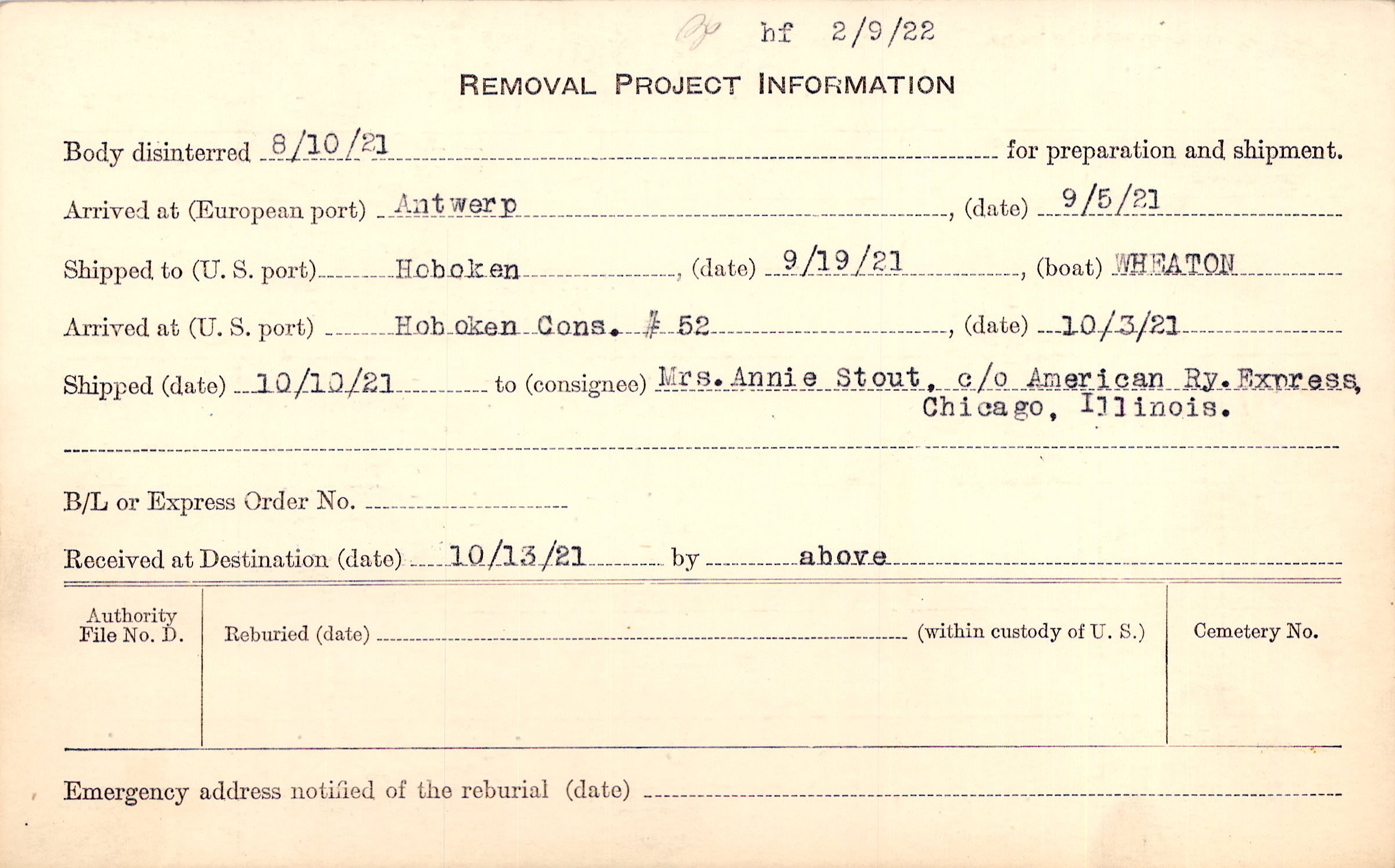 Body disinterred 8/10/1921 for preparation and shipment.