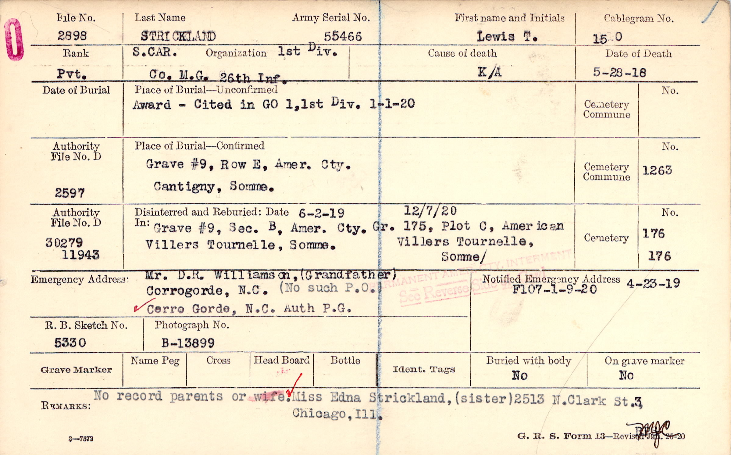 No record parents or wife. Miss Edna Strickland, (sister)2513 N. Clark St., Chicago, Ill.