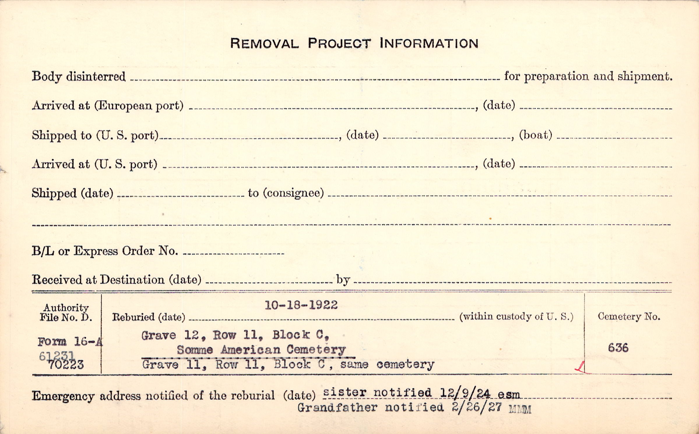 sister notified 12/9/1924 Grandfather notified 2/26/1927 |