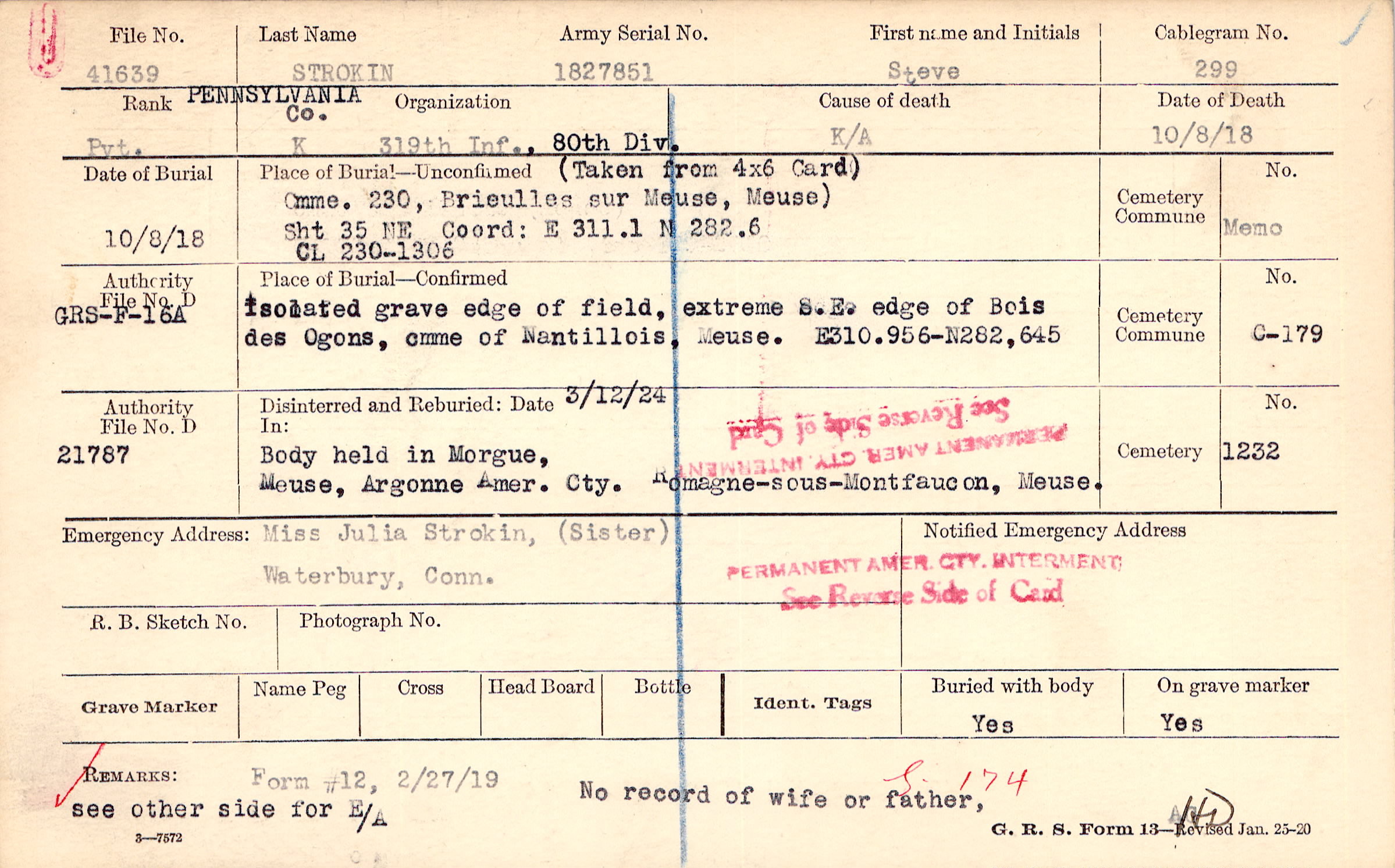 S.174 No record of wife or father, see other side for E/A, Form #12, 2/27/19