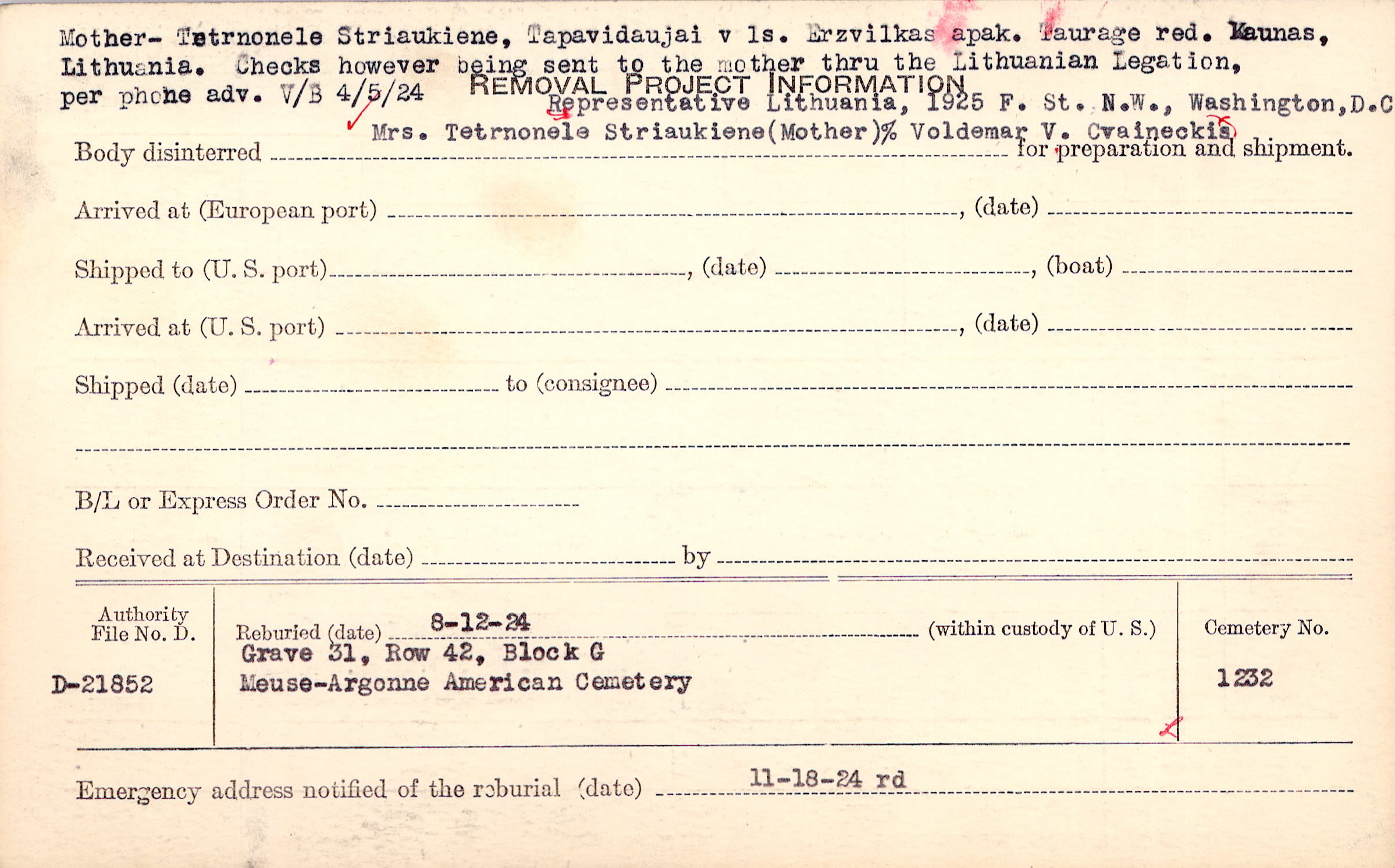 Mother- Tetrnonele Striaukiene, Tapavidaujai v ls. Erzvilkas apak. Taurage red. Maunas, Lithuania. Checks however being sent to the mother thru the Lithuanian Legation, per phone adv. V/B 4/5/24, Representative Lithuania, 1925 F St. N.W., Washington, D.C. |