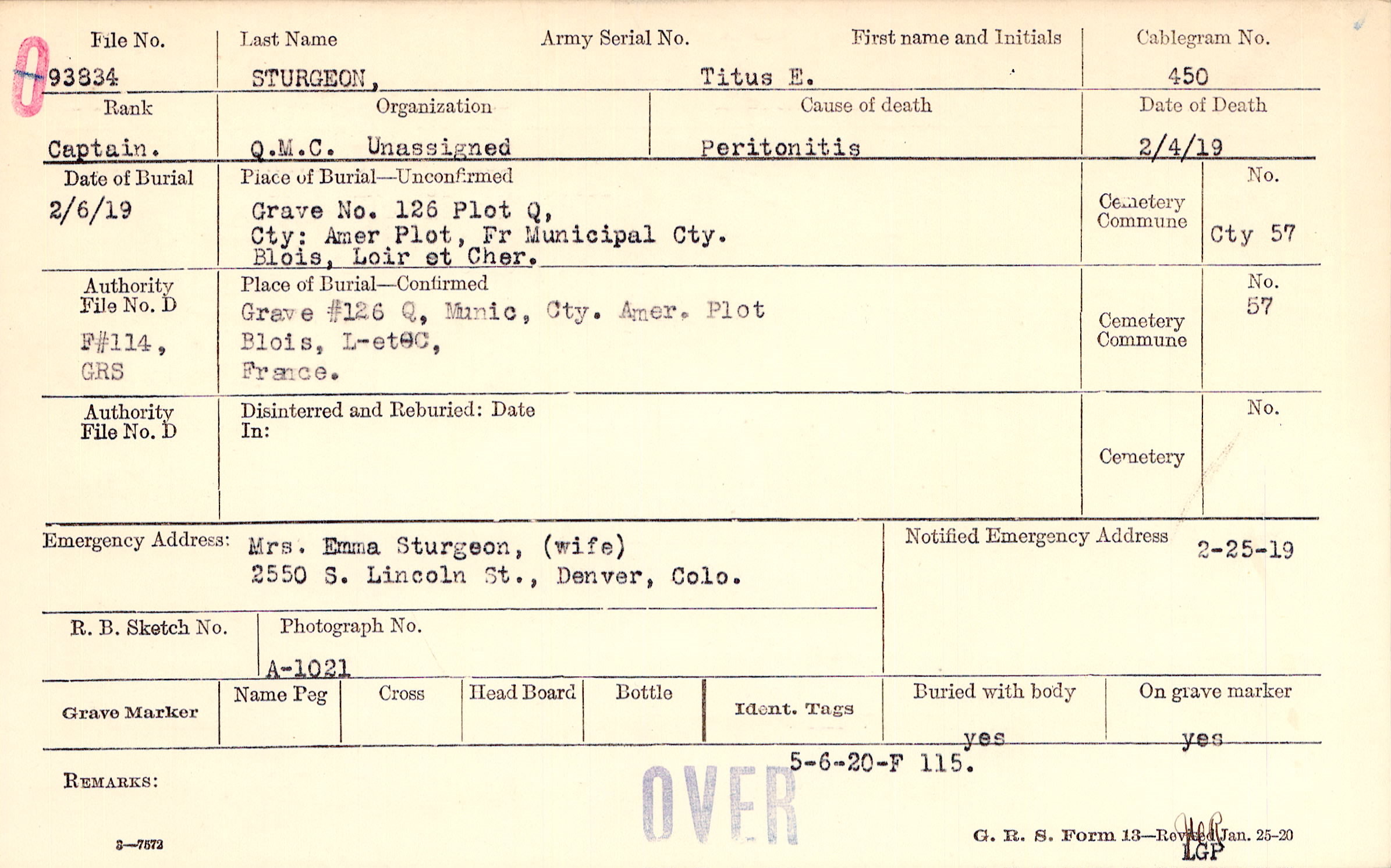 Mrs. Emma Sturgeon, (wife), 2550 S. Lincoln St., Denver, Colo.
