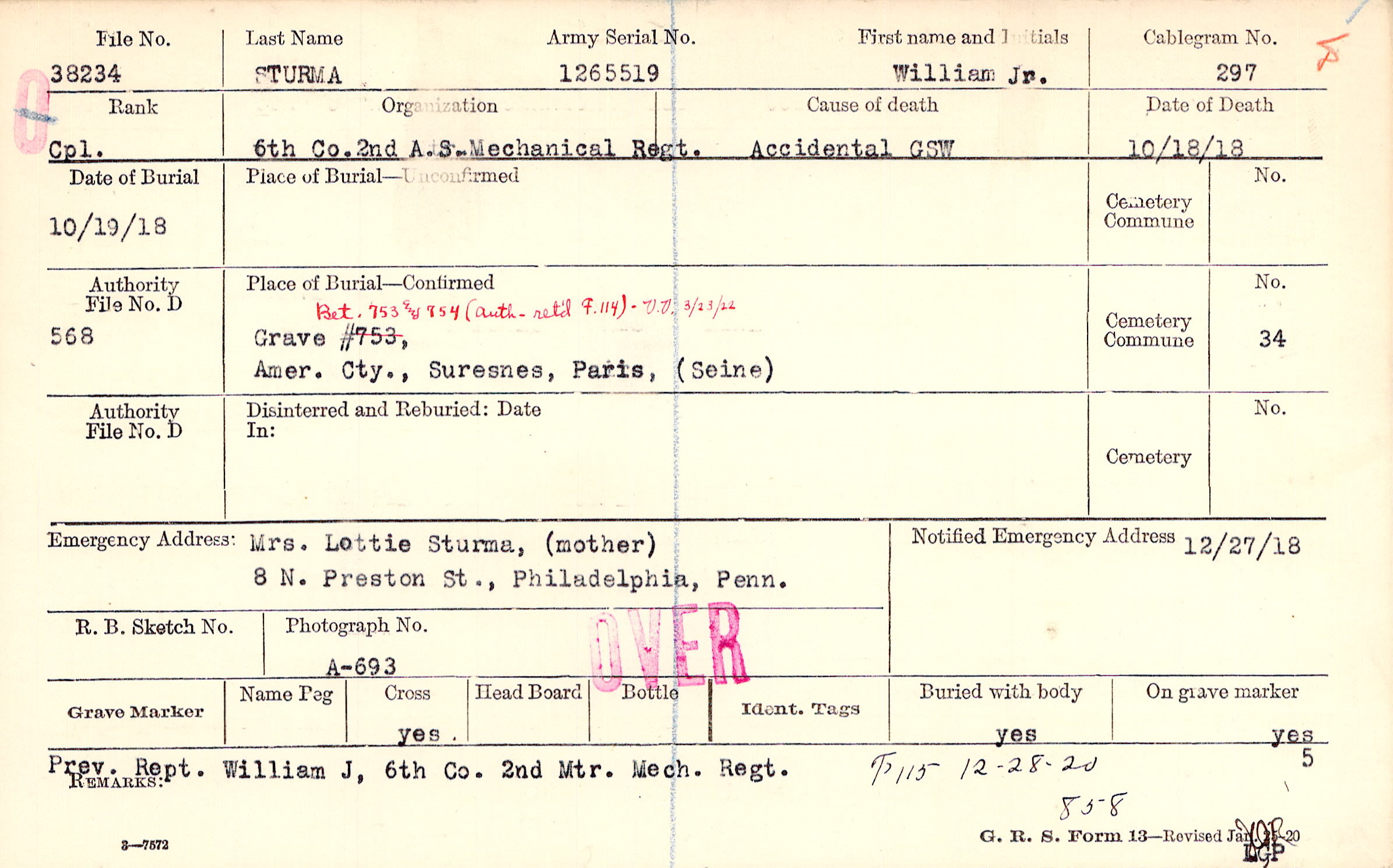 Mrs. Lottie Sturma, (mother), 8 N. Preston St., Philadelphia, Penn.