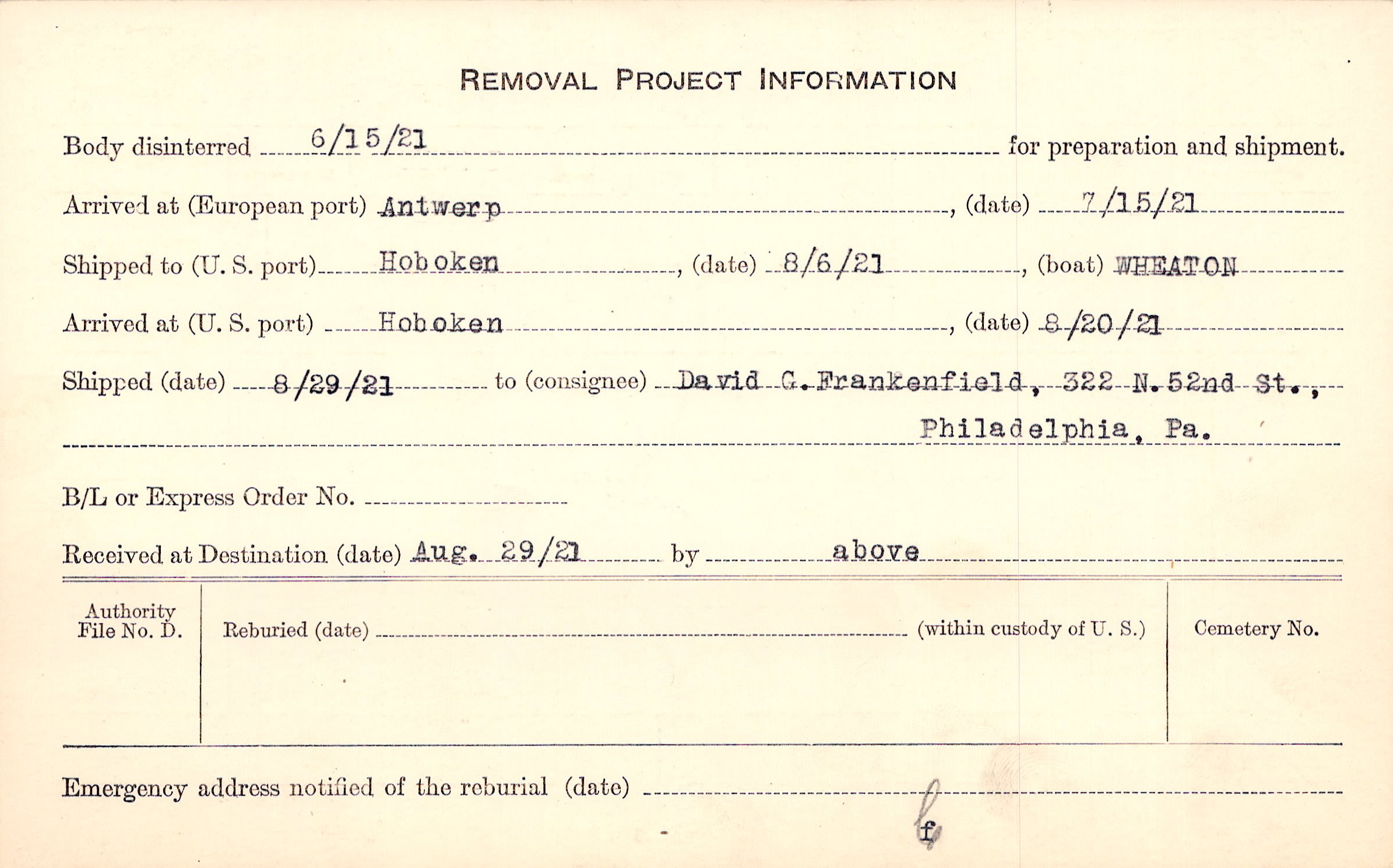 Body disinterred 6/15/1921 for preparation and shipment.