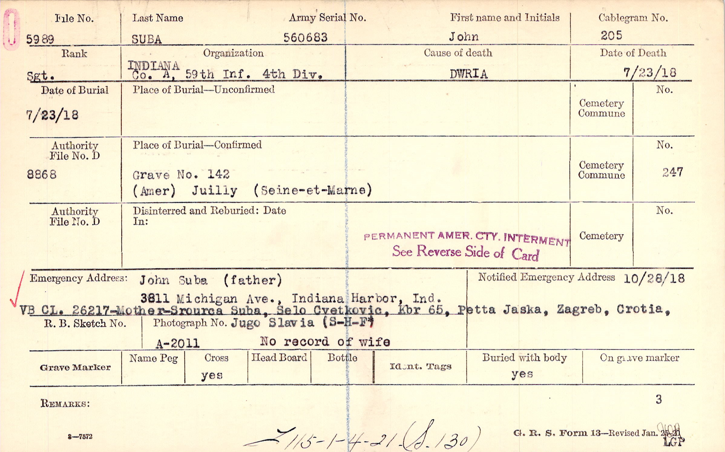 John Suba (father), 3811 Michigan Ave., Indiana Harbor, Ind., VB CL. 26217 Mother Srourca Suba, Selo Cvetkovic, Kbr 65, Petta Jaska, Zagreb, Crotia, Jugo Slavia (S-H-F) No record of wife
