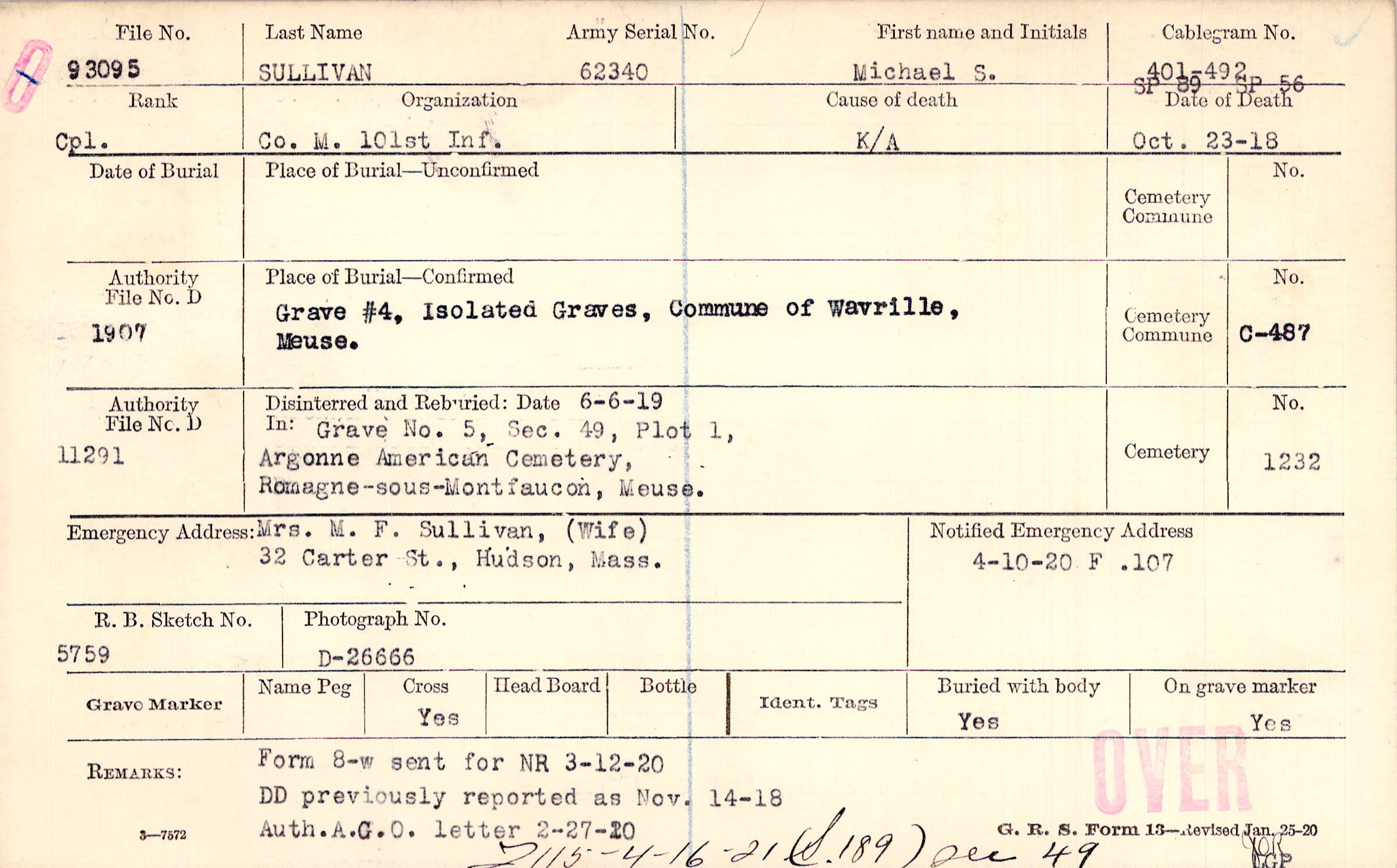 Mrs. M.F. Sullivan, (Wife), 32 Carter St., Hudson, Mass.