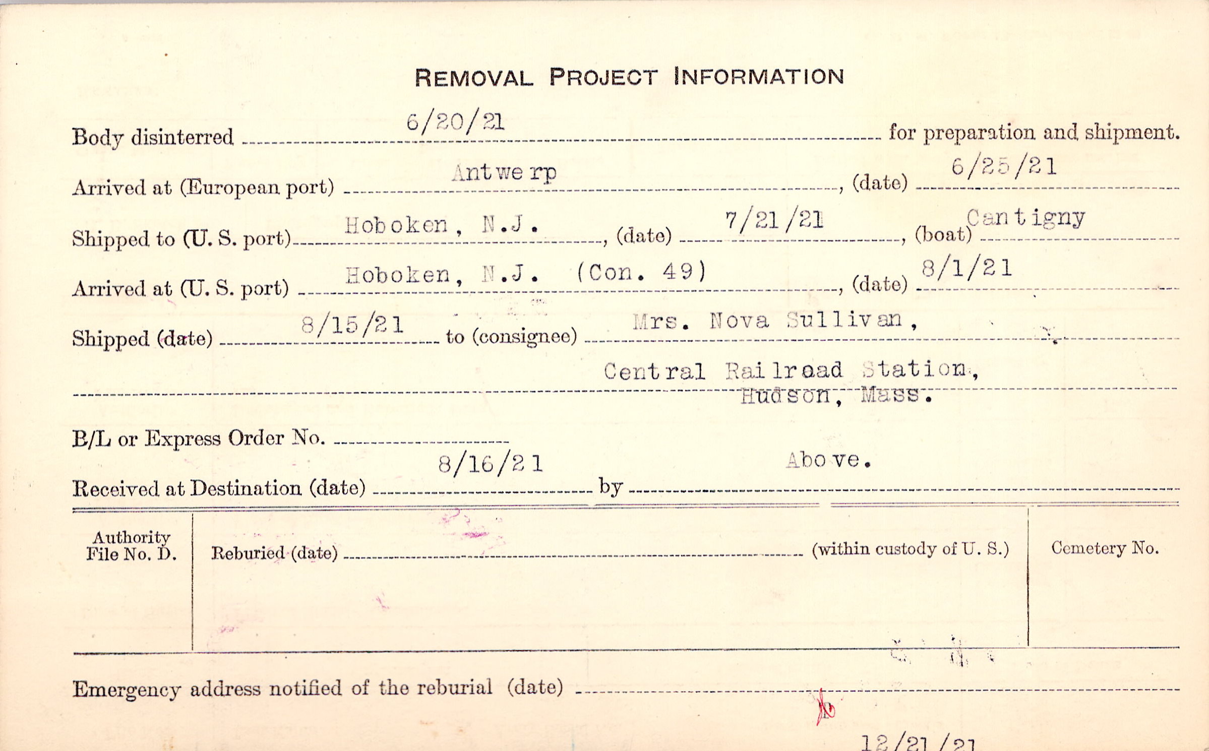 Body disinterred 6/20/1921 for preparation and shipment.
