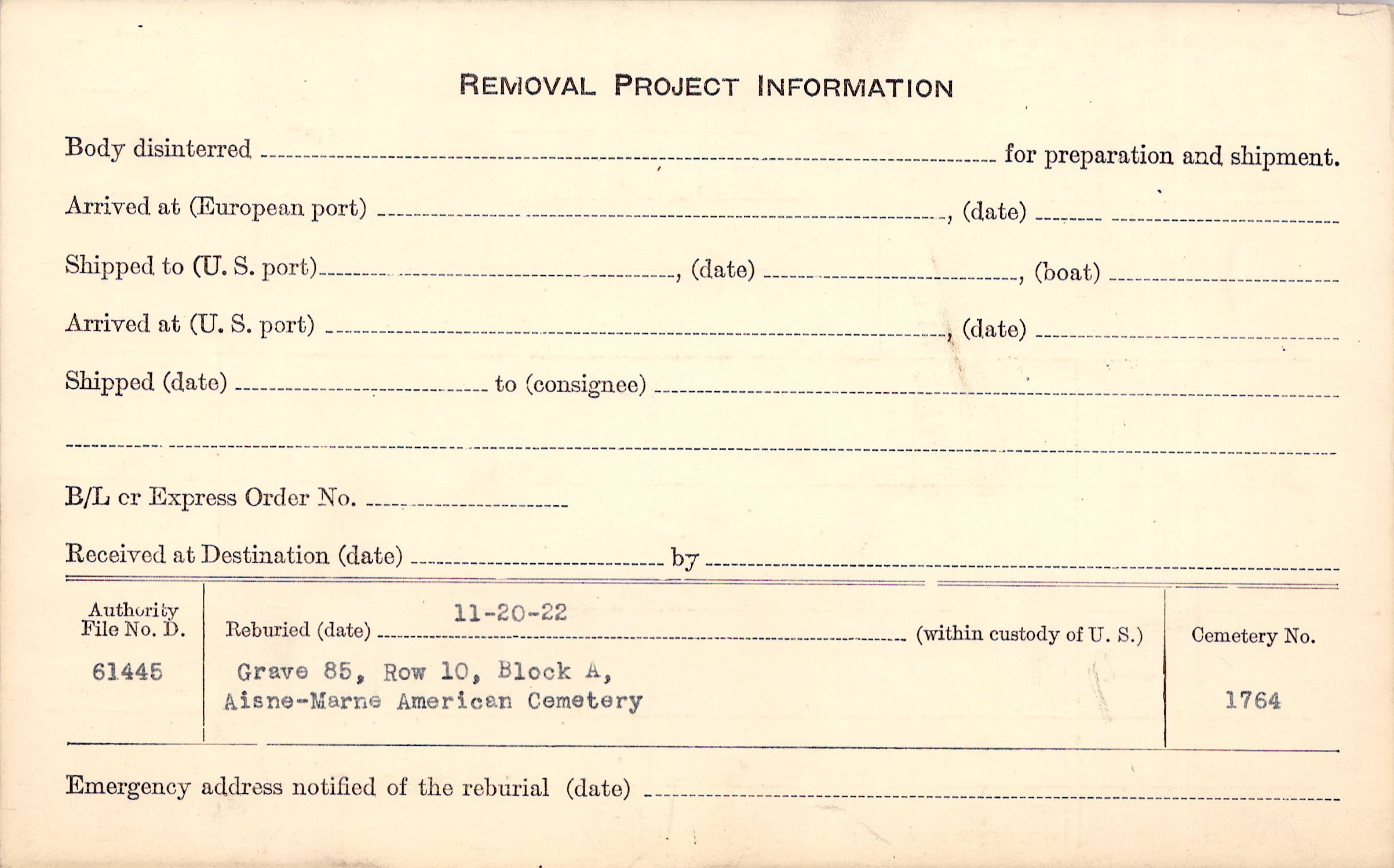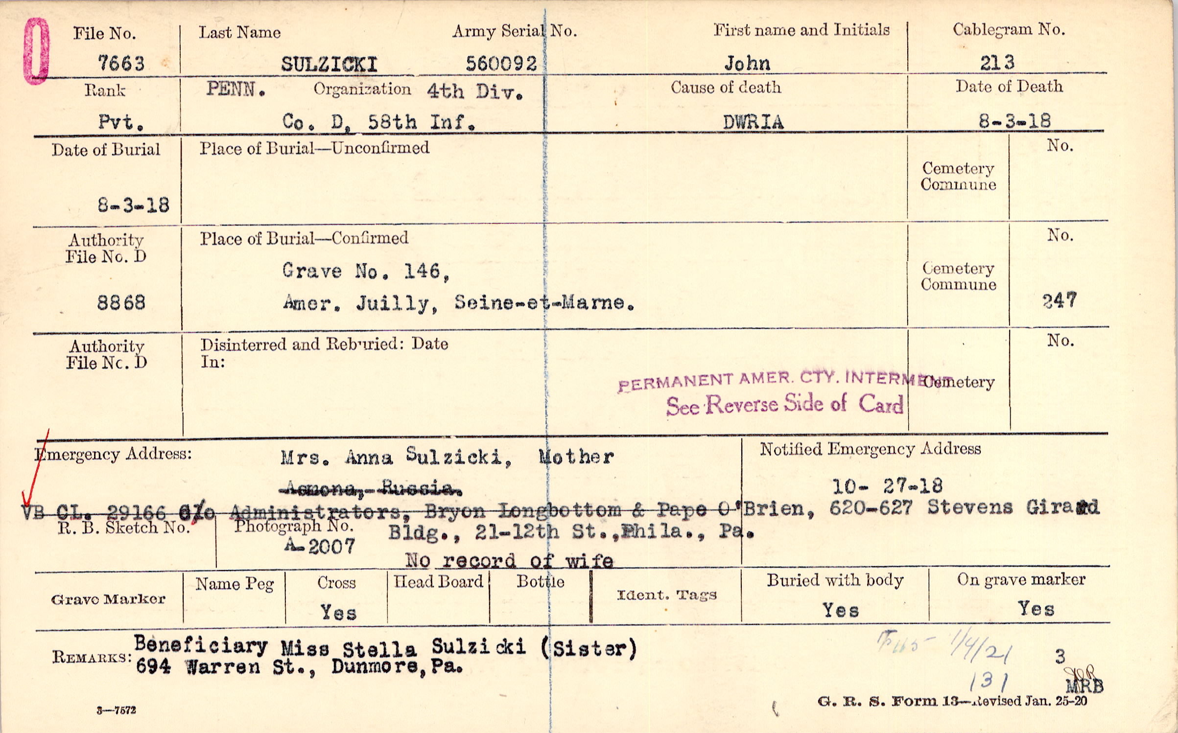 Mrs. Anna Sulzicki, Mother, c/o Administrators, Bryon Longbottom & Pape O'Brien, 620-627 Stevens Girard Bldg., 21-12th St.,Phila., Pa., VB CL. 29166 No record of wife