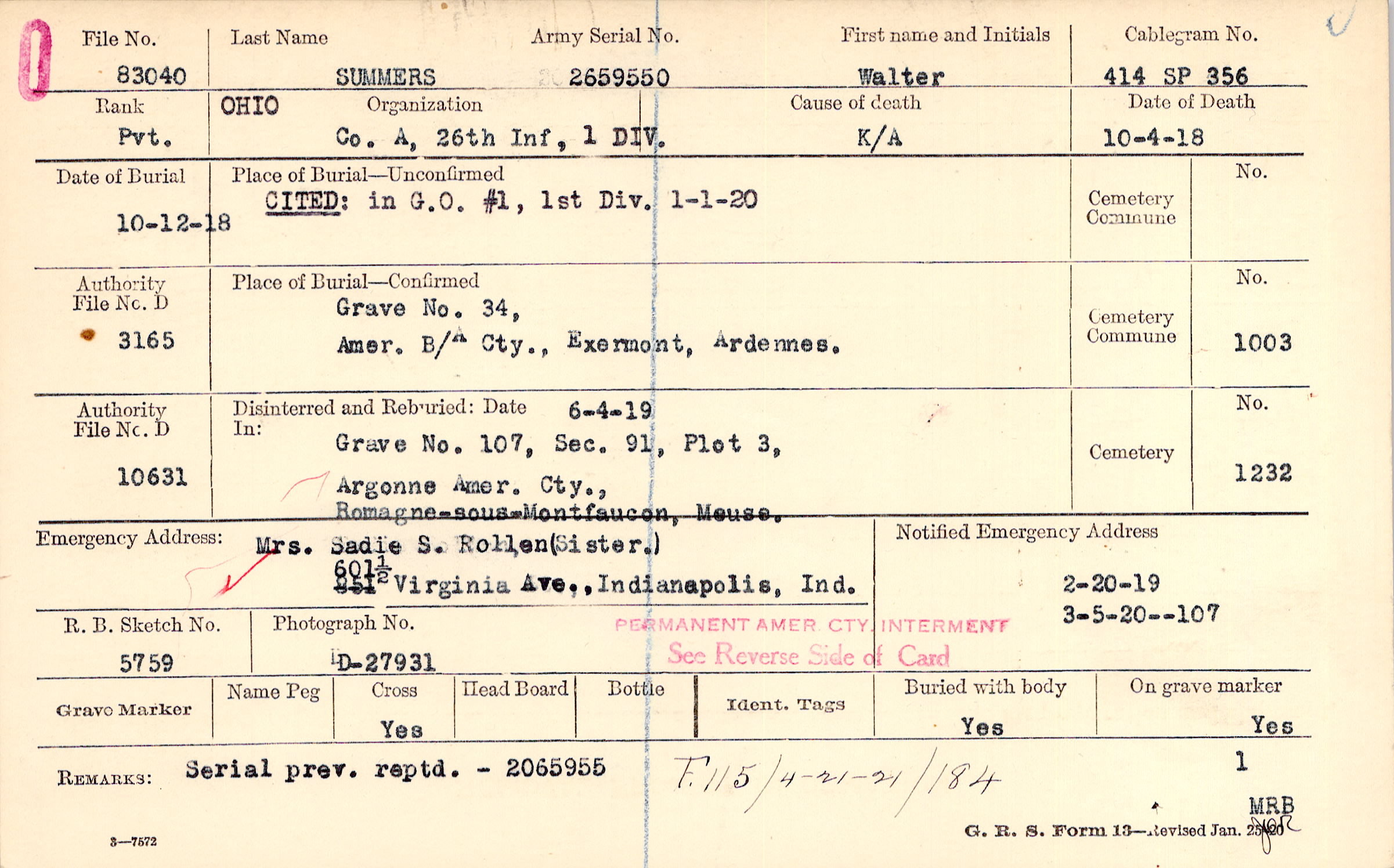 Grave 34, Amer. B/A Cty., Exermont, Ardennes.