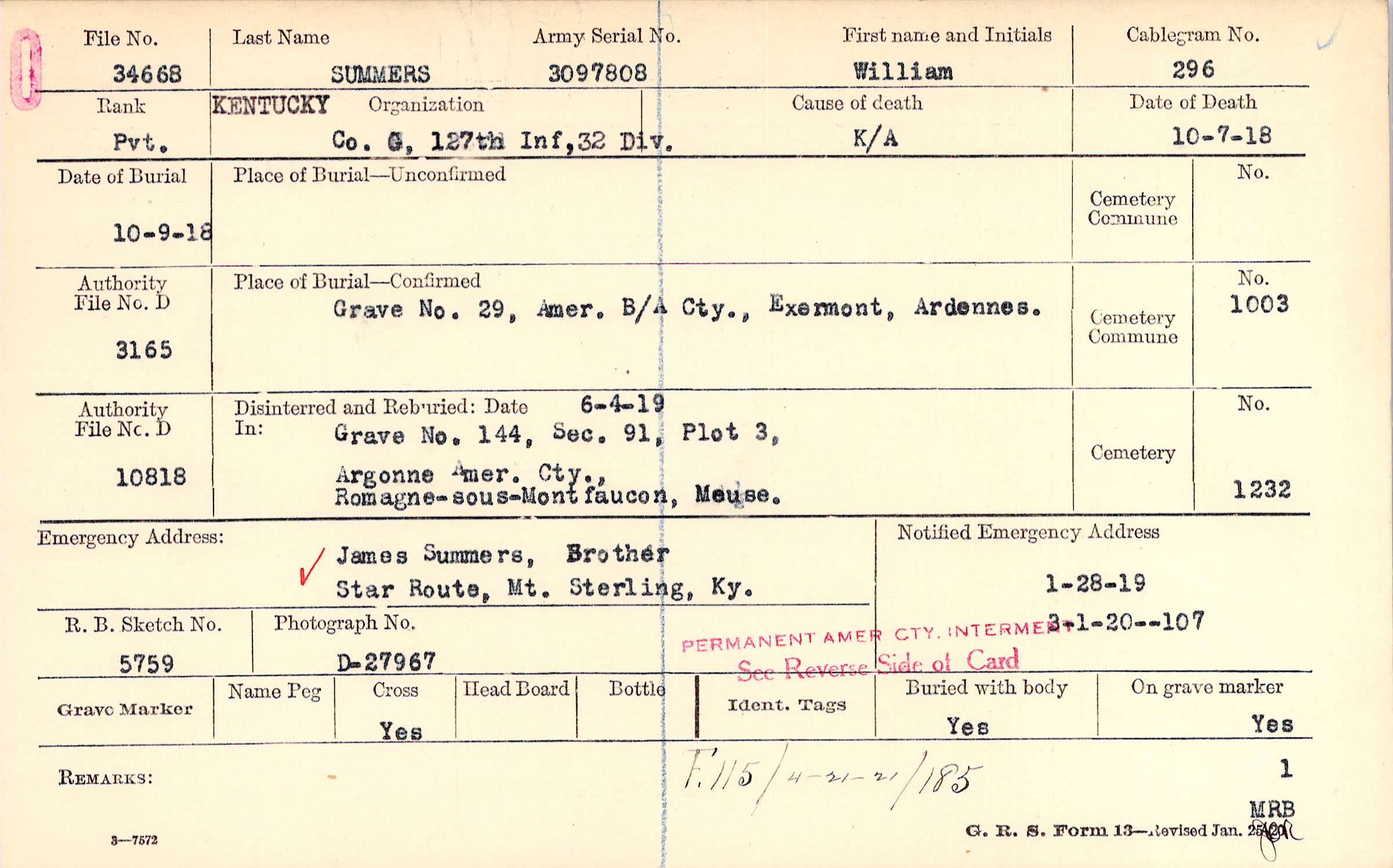 James Summers, Brother, Star Route, Mt. Sterling, Ky., PERMANENT AMER CTY. INTERMENT See Reverse Side of Card
