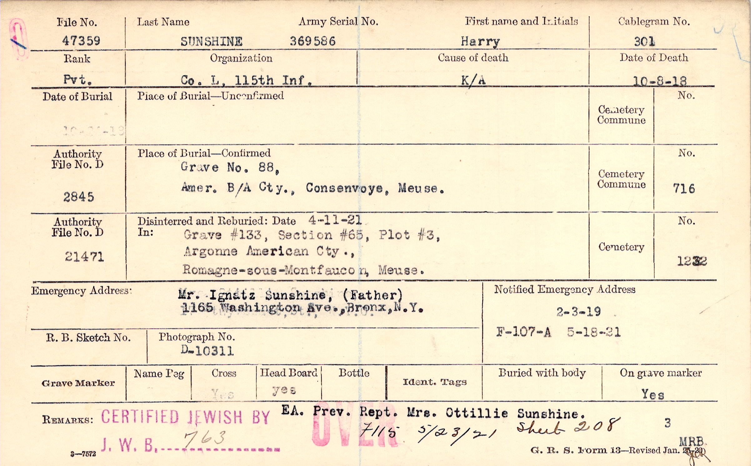 Mr. Ignatz Sunshine, (Father), 1165 Washington Ave., Bronx, N.Y.