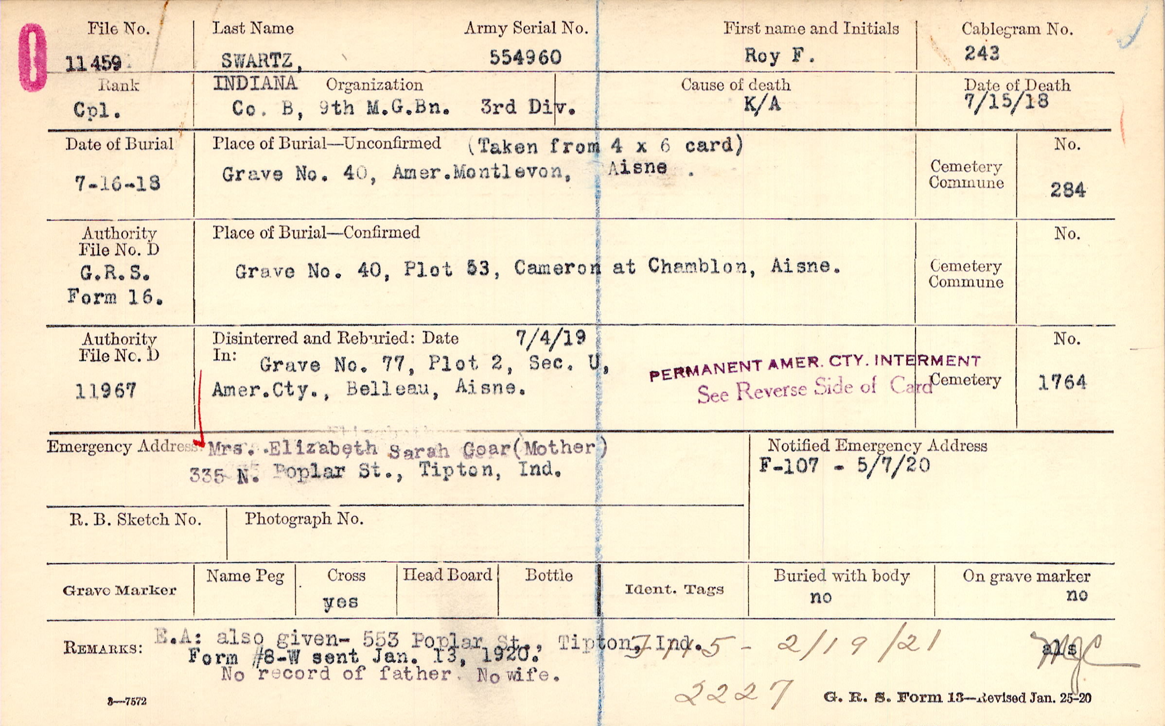 Mrs. Elizabeth Sarah Goar(Mother), 335 N. Poplar St., Tipton, Ind.