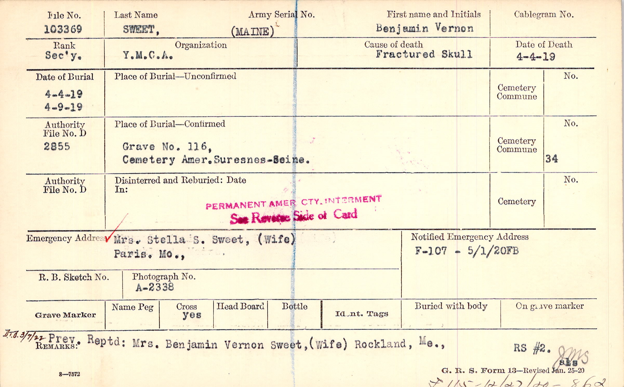 Grave 116, Cemetery Amer., Suresnes-Seine.