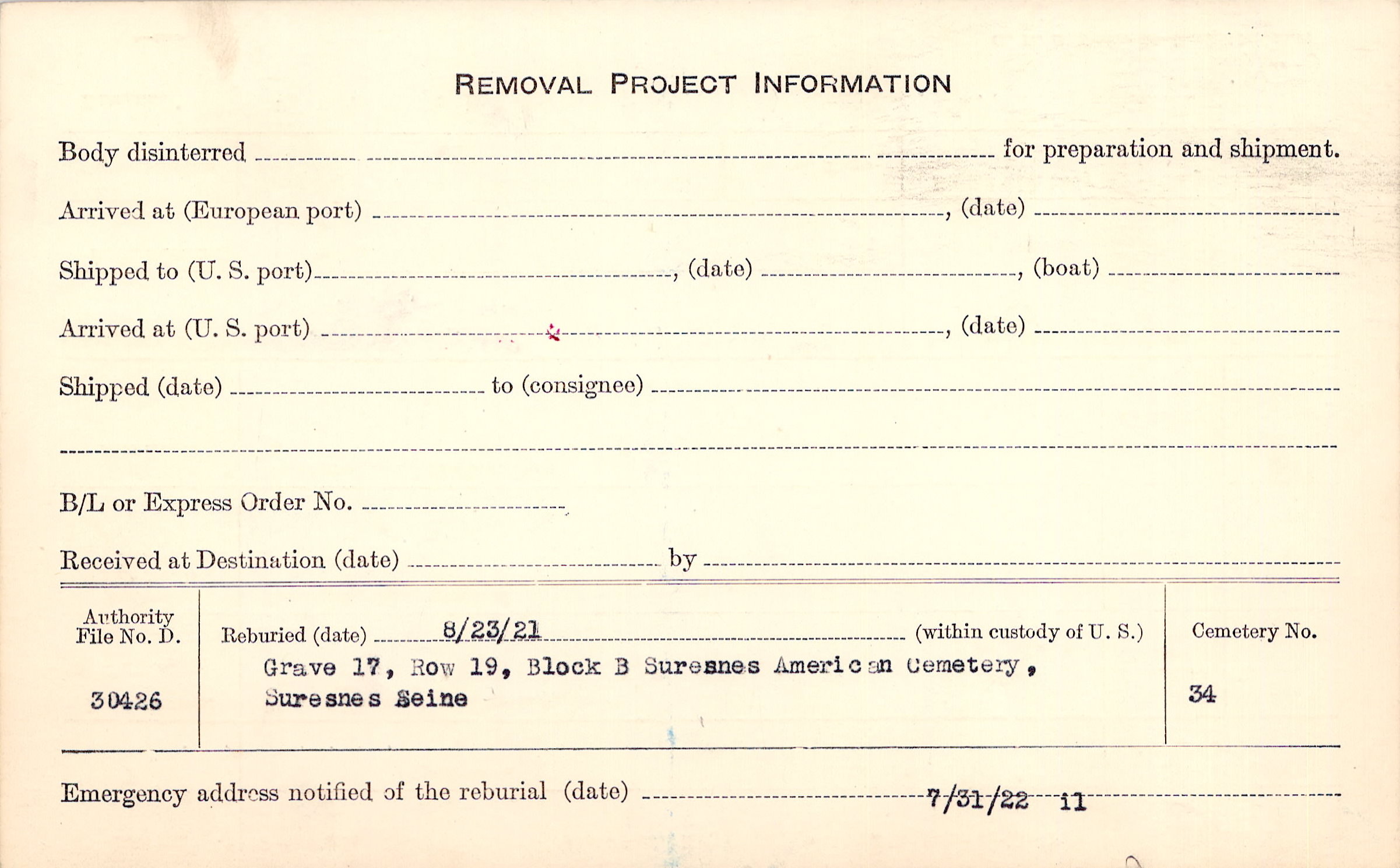 | Permanent Burial in Foreign Cemetery |