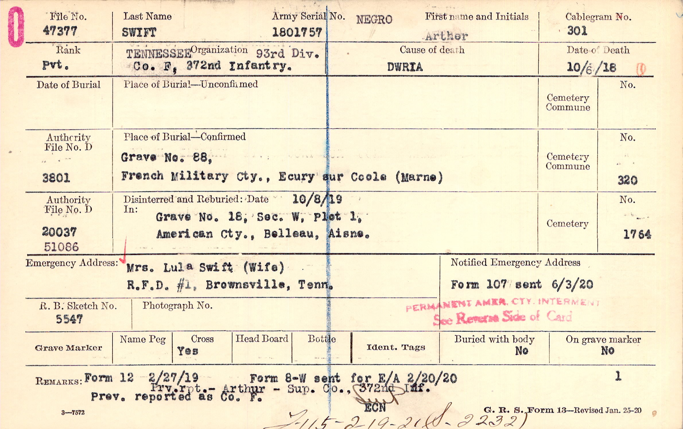 Prv. rpt.- Arthur - Sup. Co., 372nd Inf. Prev. reported as Co. F., Form 8-W sent for E/A 2/20/20, Form 12 2/27/19, F-115 - 2-19-21 (S-2232)