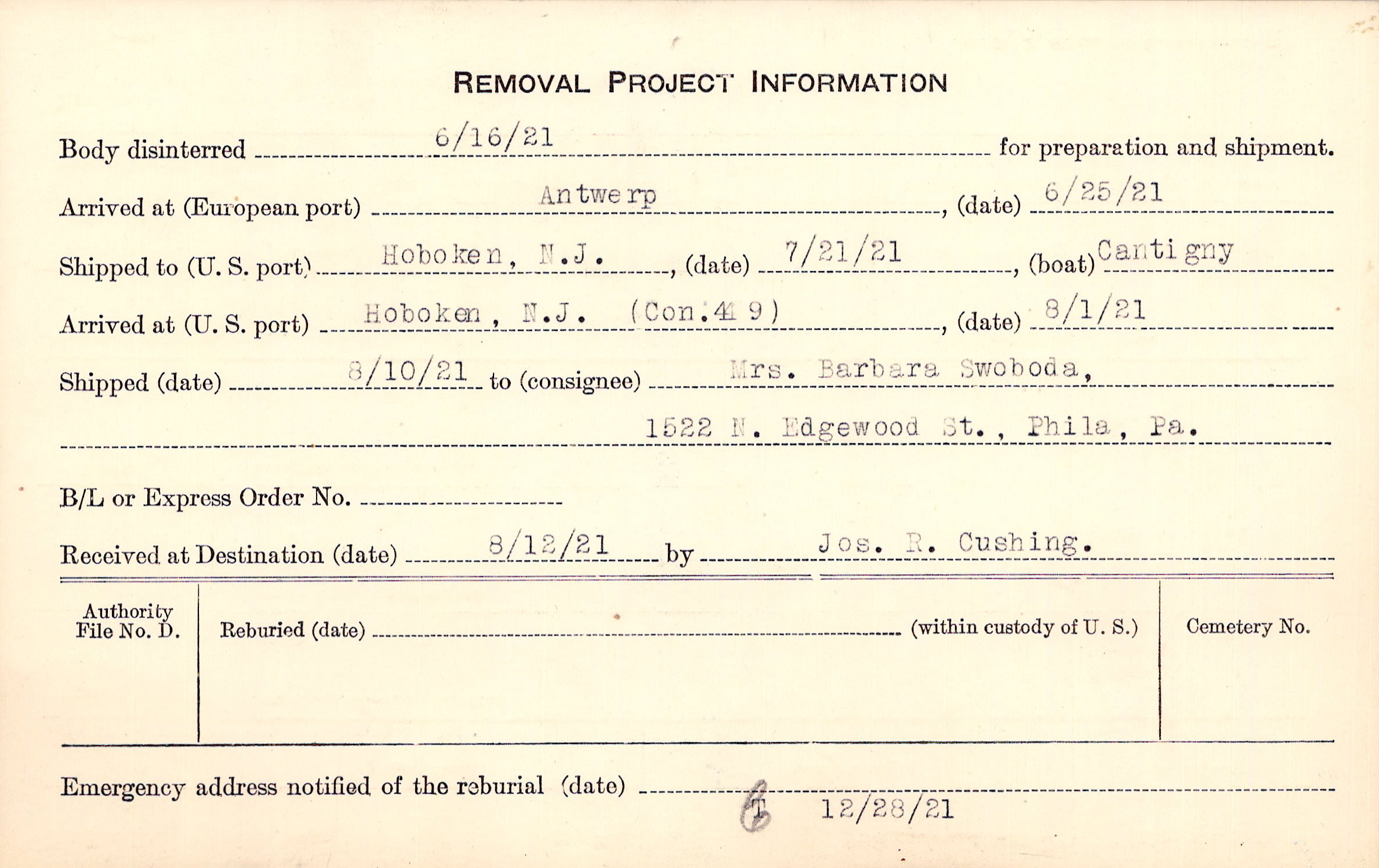 Mrs. Barbara Swoboda, (Mother), 1522 No. Edgewood St. , Phila. Pa,