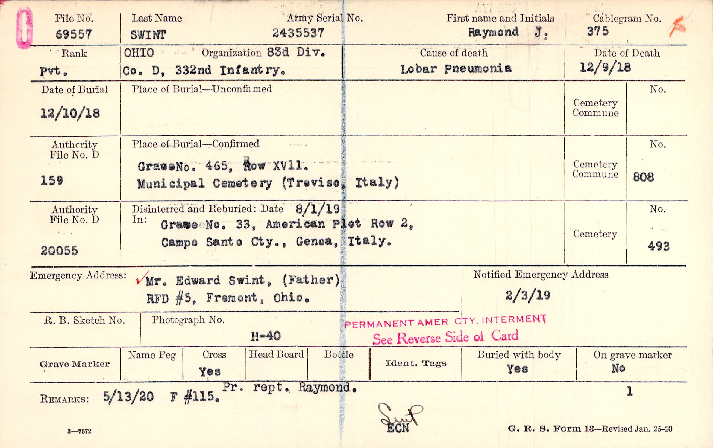 Mr. Edward Swint, (Father), RFD #5, Fremont, Ohio.