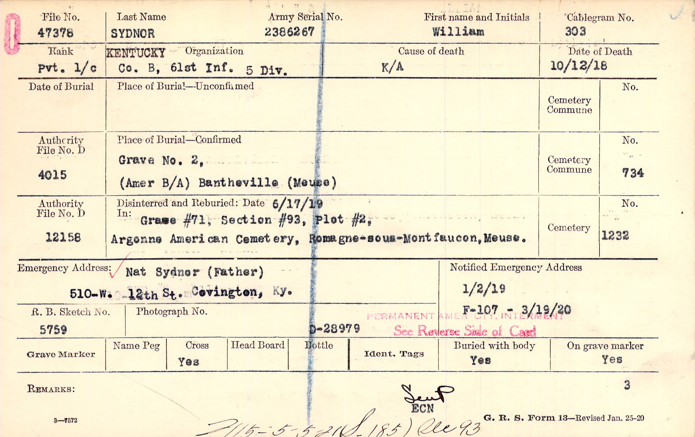 Nat Sydner (Father), 510-W. 12th St. Covington, Ky.