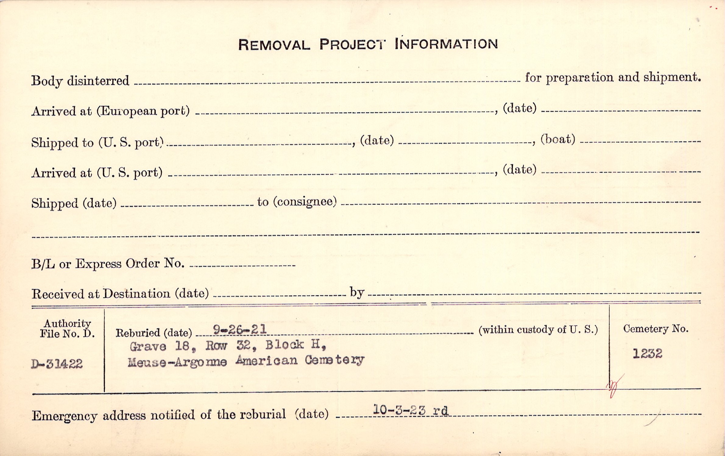 | Permanent Burial in Foreign Cemetery |