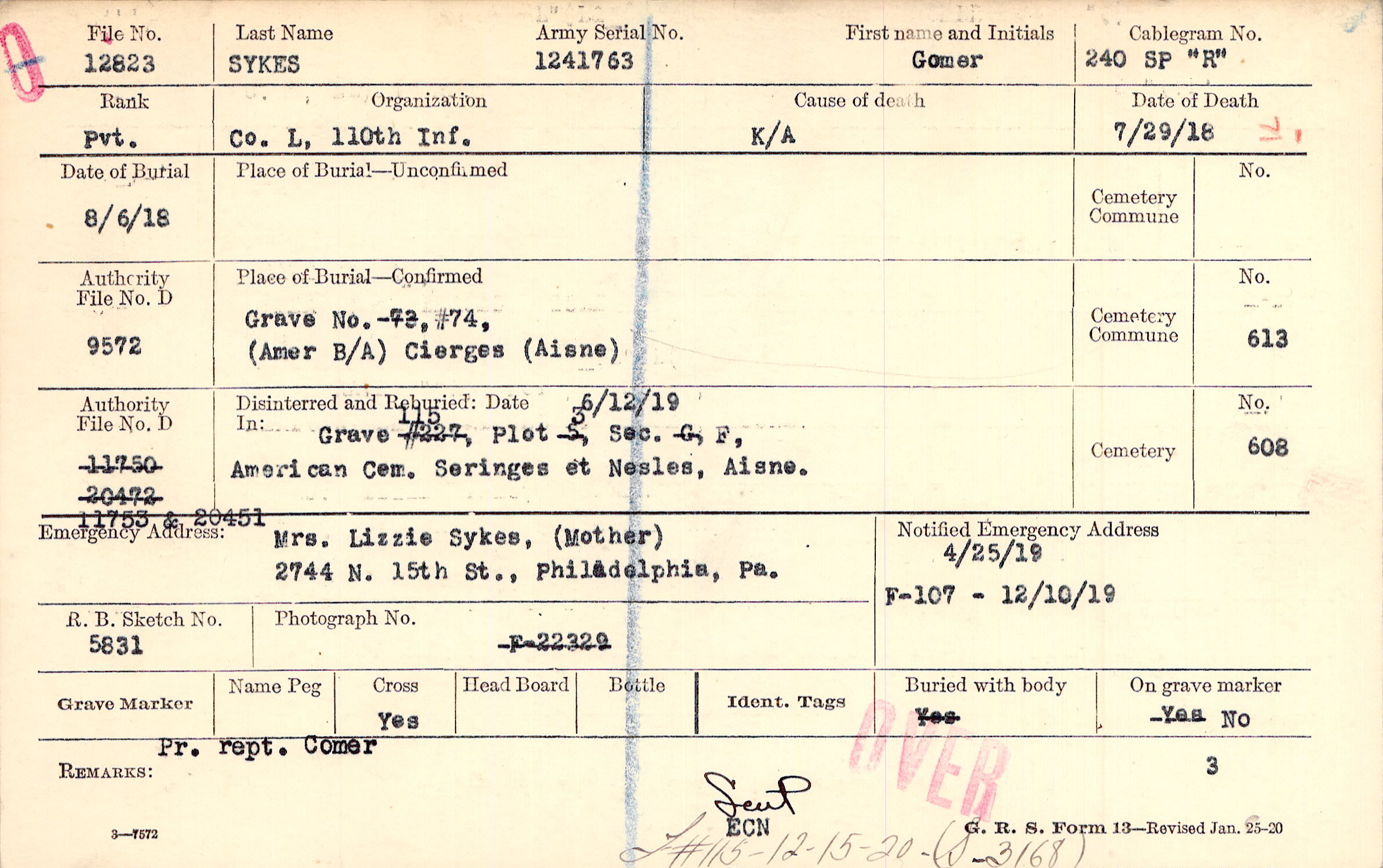Mrs. Lizzie Sykes, (Mother), 2744 N. 15th St., Philadelphia, Pa.