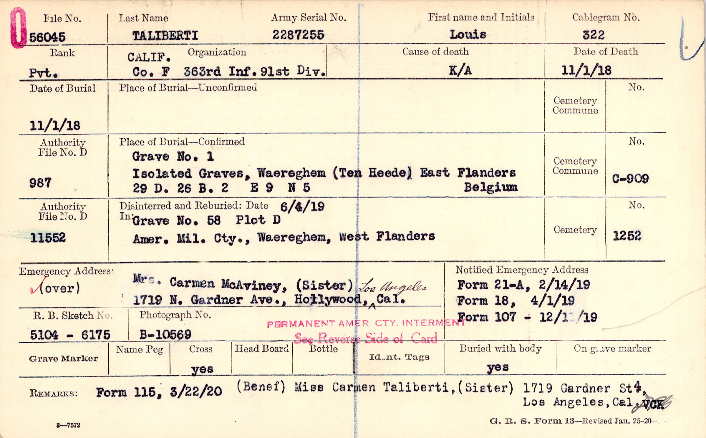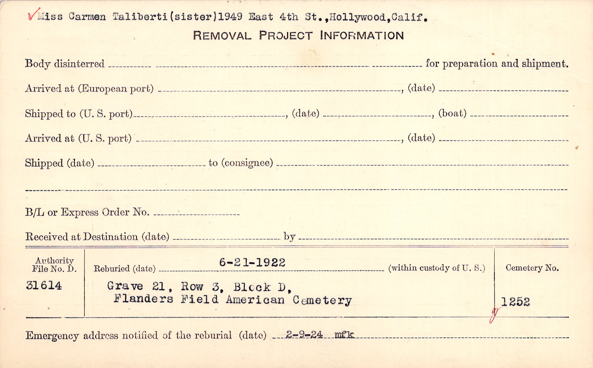 Miss Carmen Taliberti (sister), 1949 East 4th St., Hollywood, Calif. |