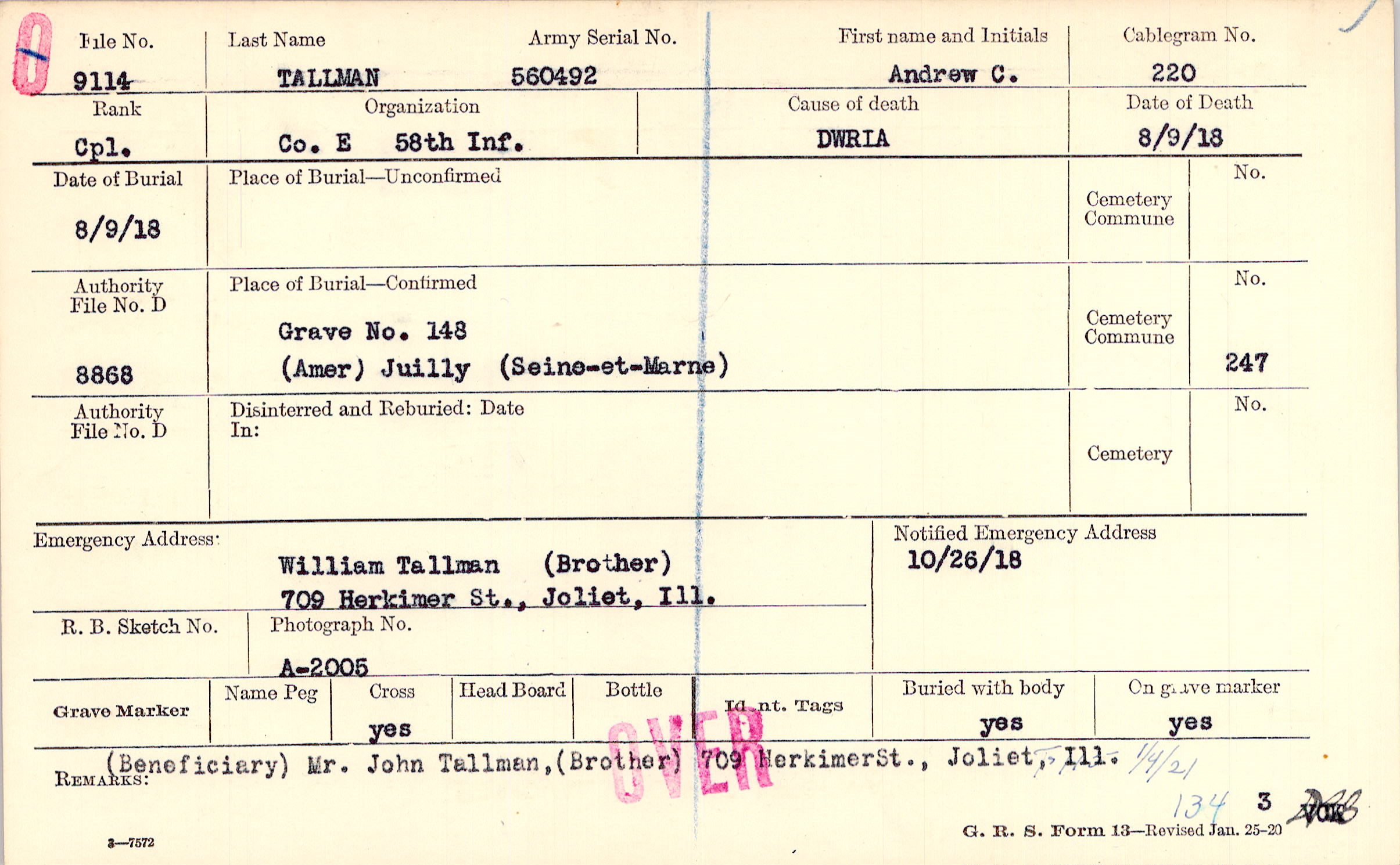 William Tallman (Brother), 709 Herkimer St., Joliet, Ill.