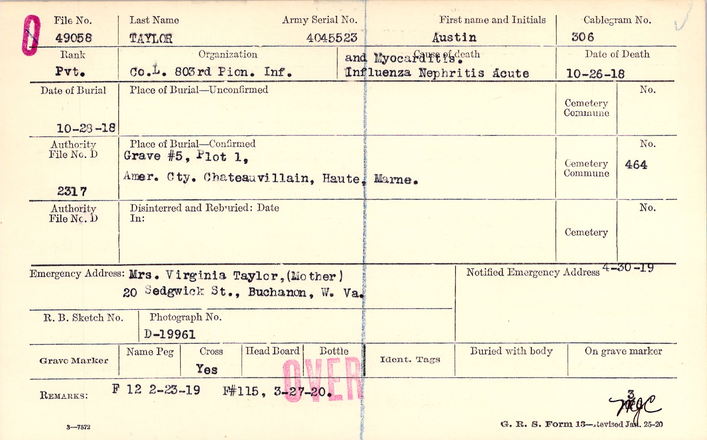 Mrs. Virginia Taylor,(Mother), 20 Sedgwick St., Buchanon, W. Va.