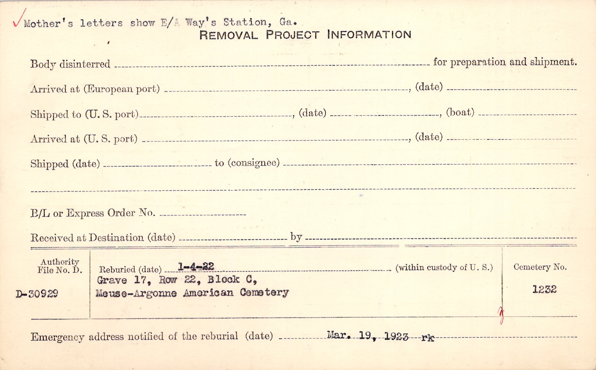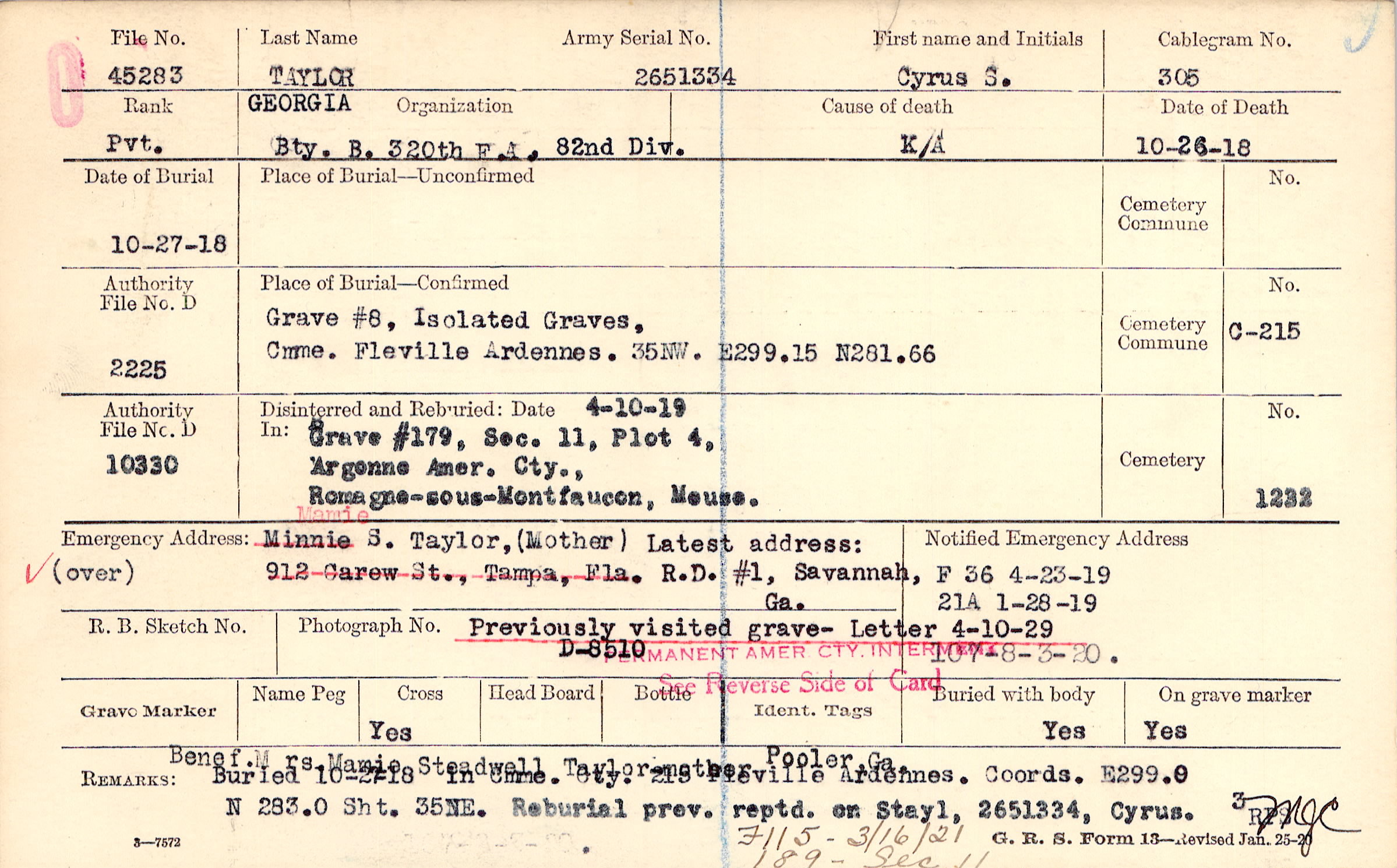 Mamie S. Taylor, (Mother), R.D. #1, Savannah, Ga., (over) Latest address: Previously visited grave - Letter 4-10-29