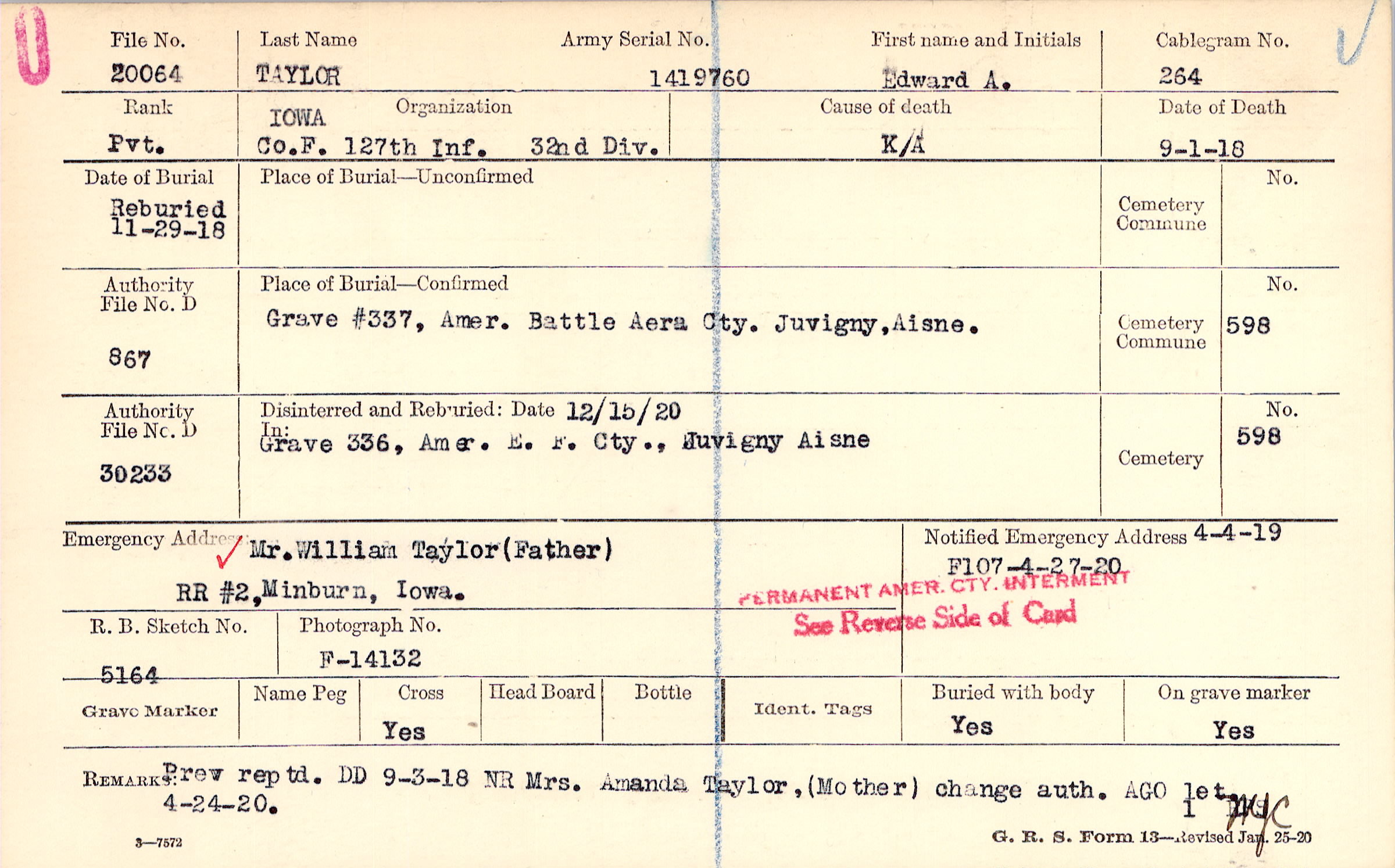 Prev reptd. DD 9-3-18 NR Mrs. Amanda Taylor, (Mother) change auth. AGO let 4-24-20.