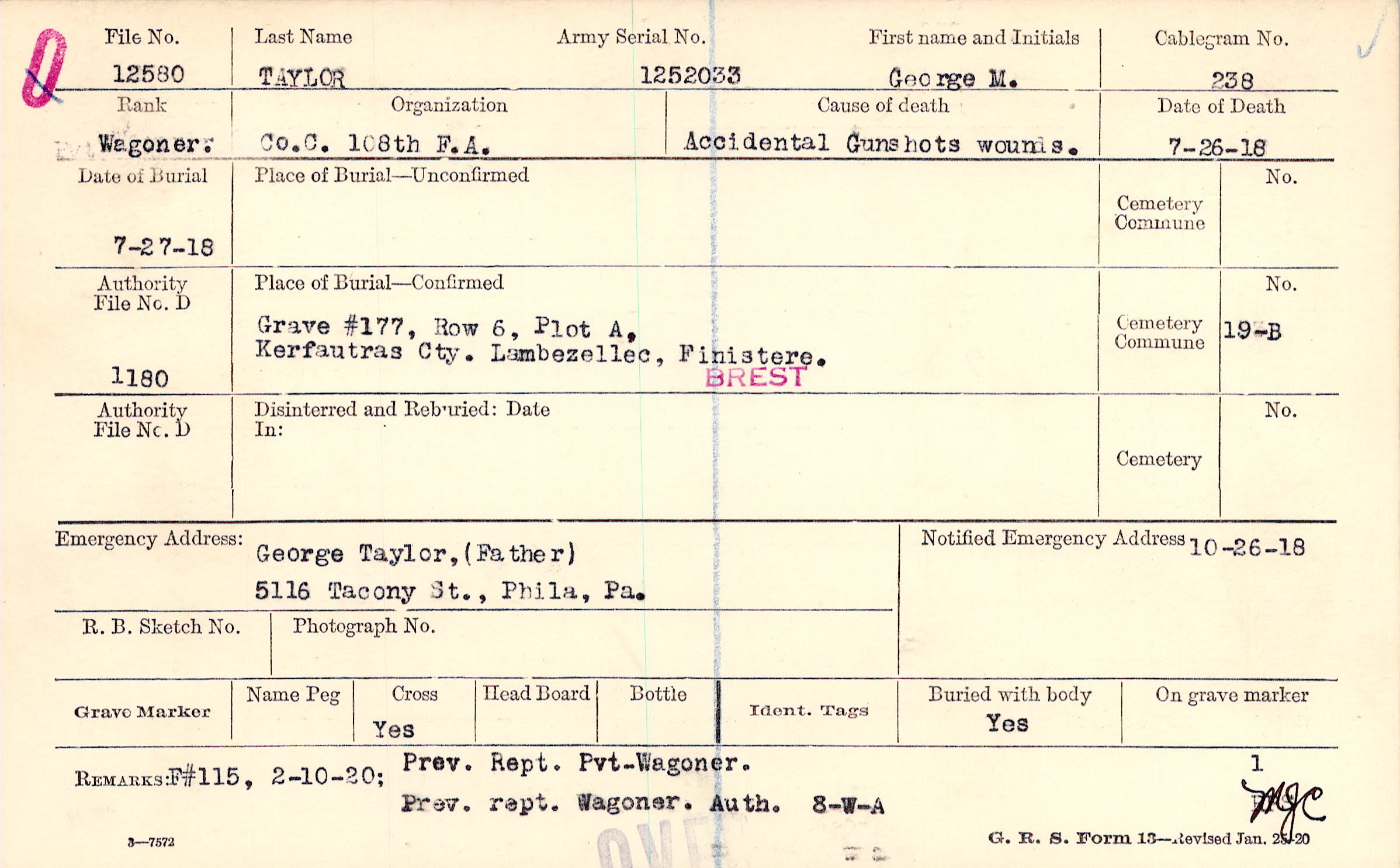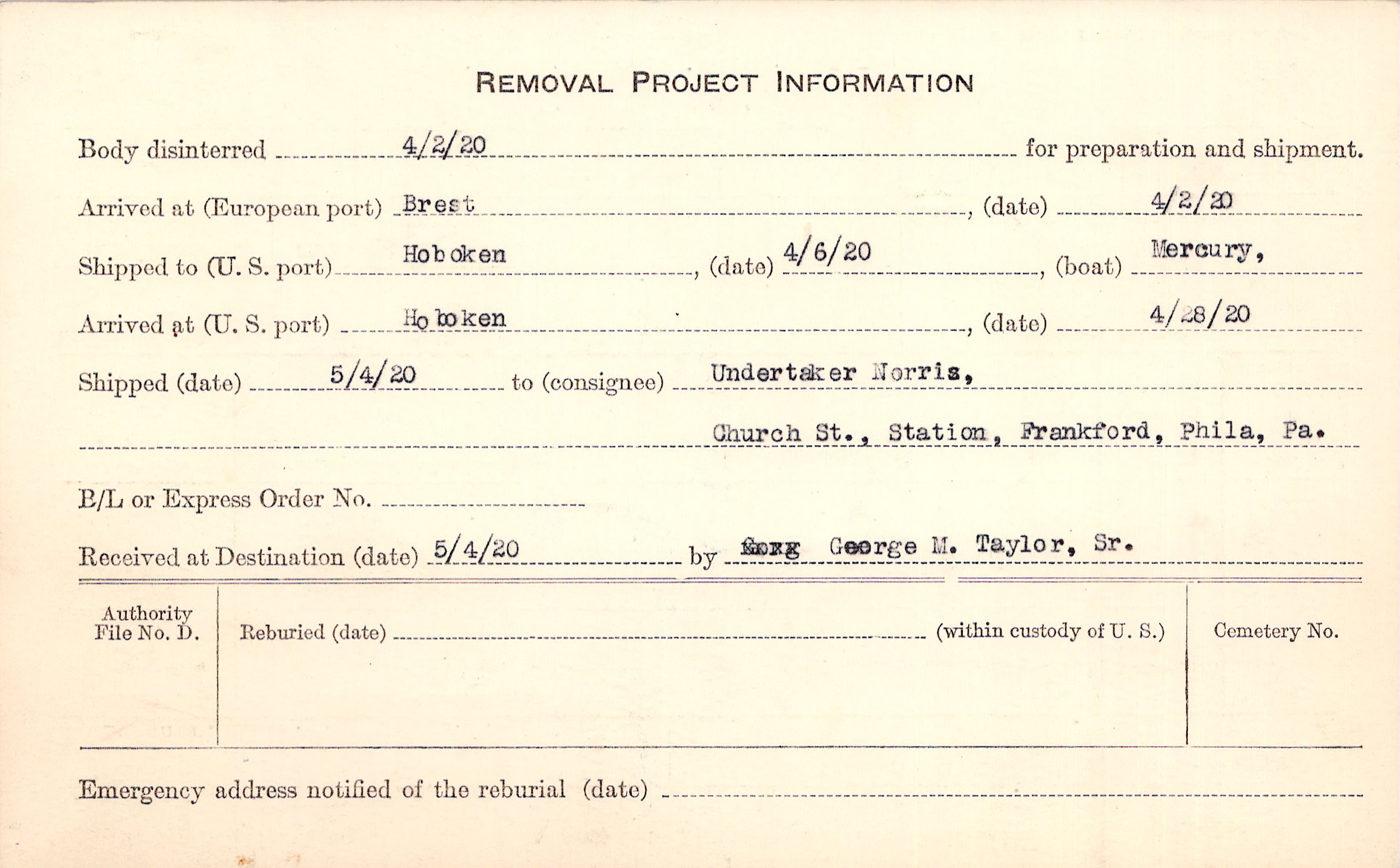 George Taylor, (Father), 5116 Tacony St., Phila, Pa.