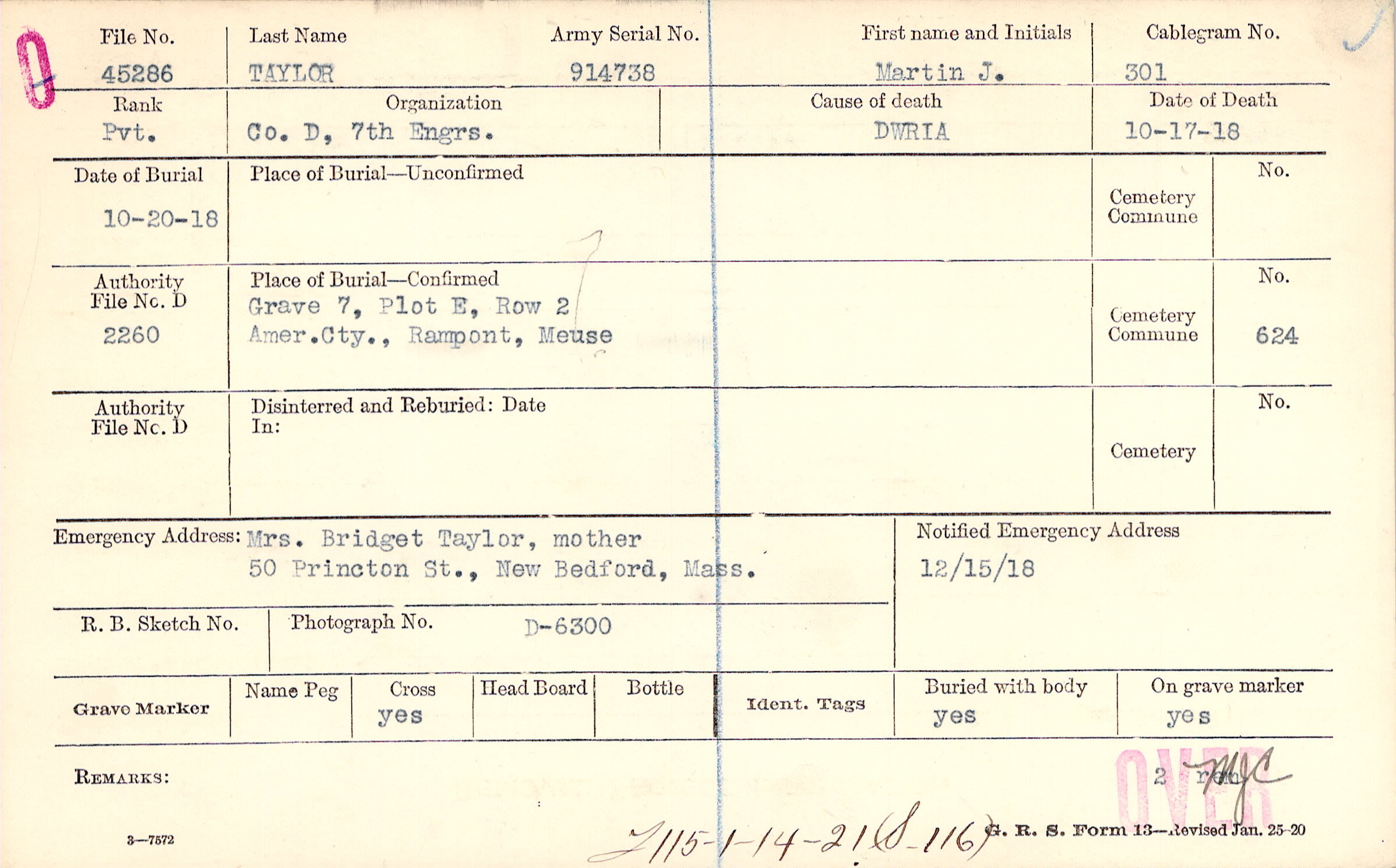 Mrs. Bridget Taylor, mother, 50 Princton St., New Bedford, Mass.