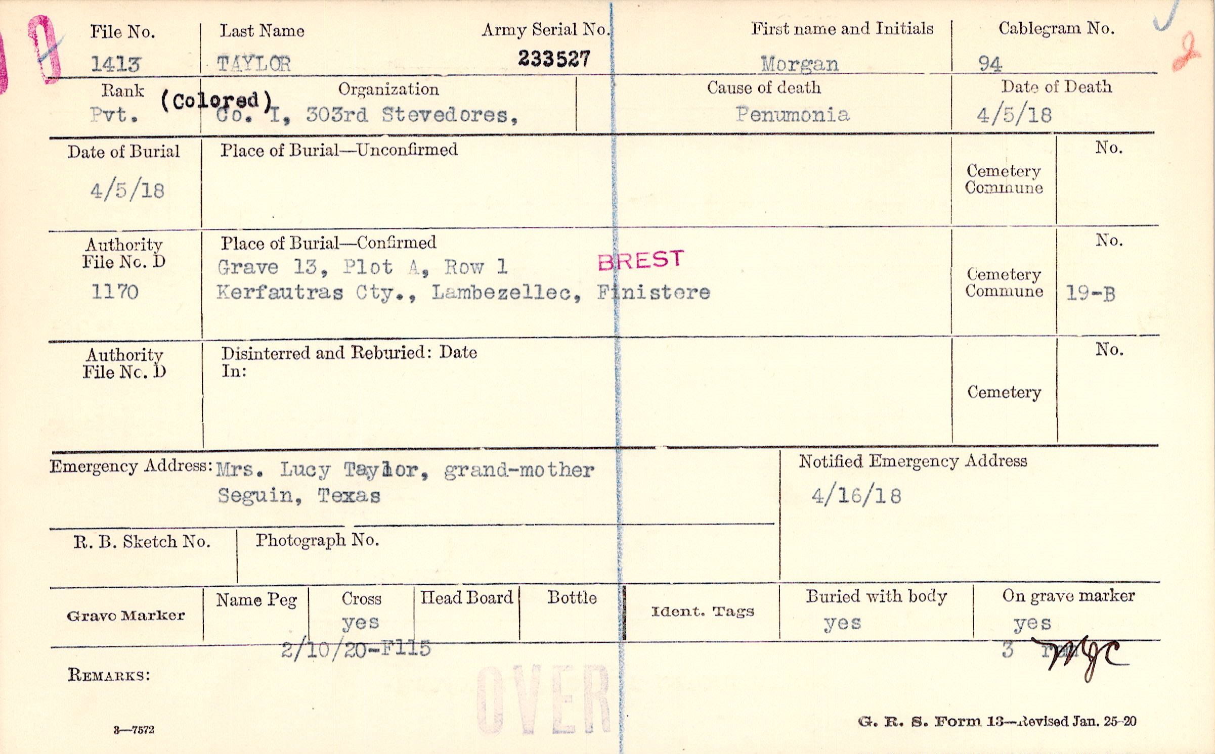Grave 13, Plot A, Row 1, Kerfautras Cty., Lambezellec, Finistere