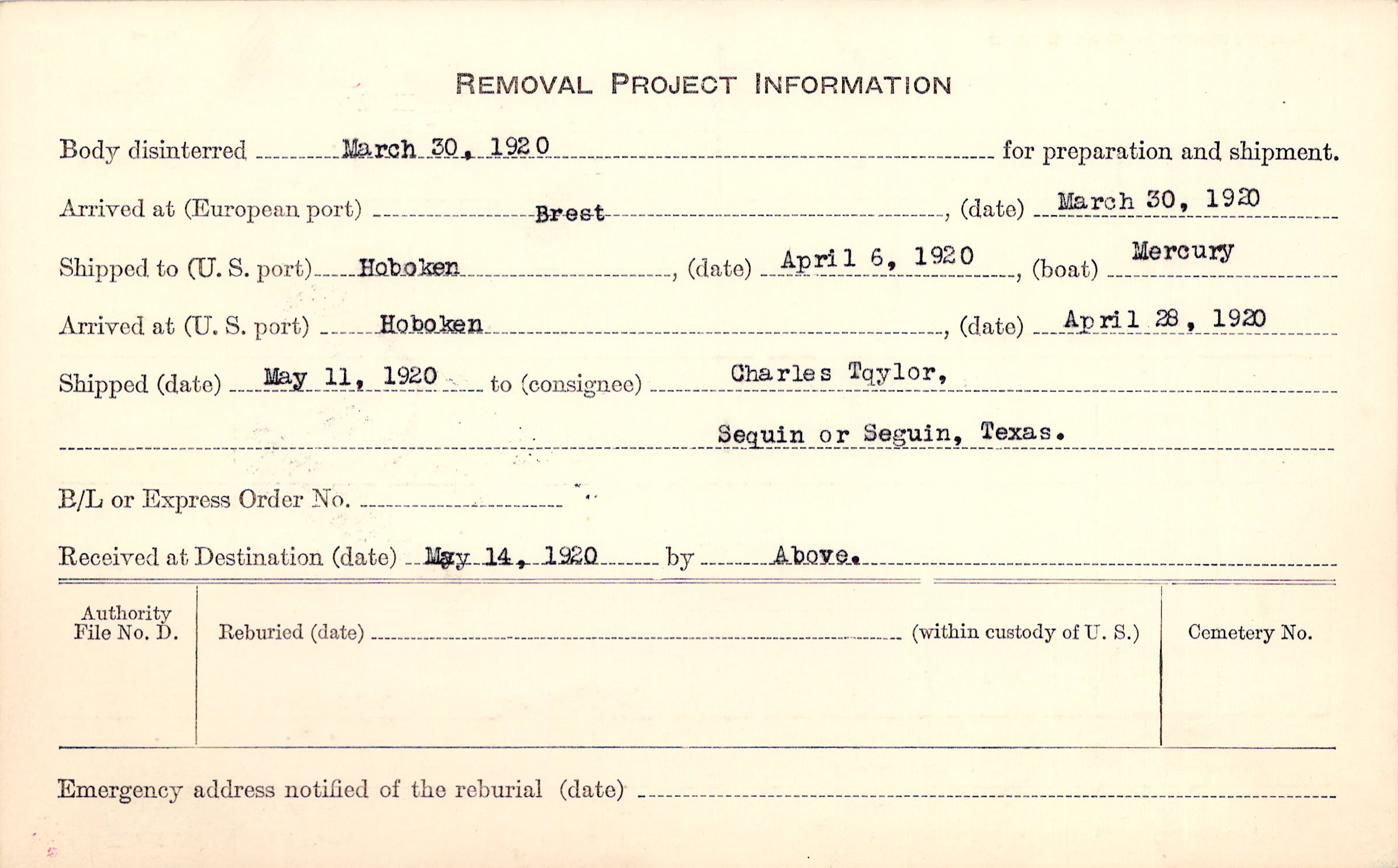 Body disinterred 3/30/1920 for preparation and shipment.