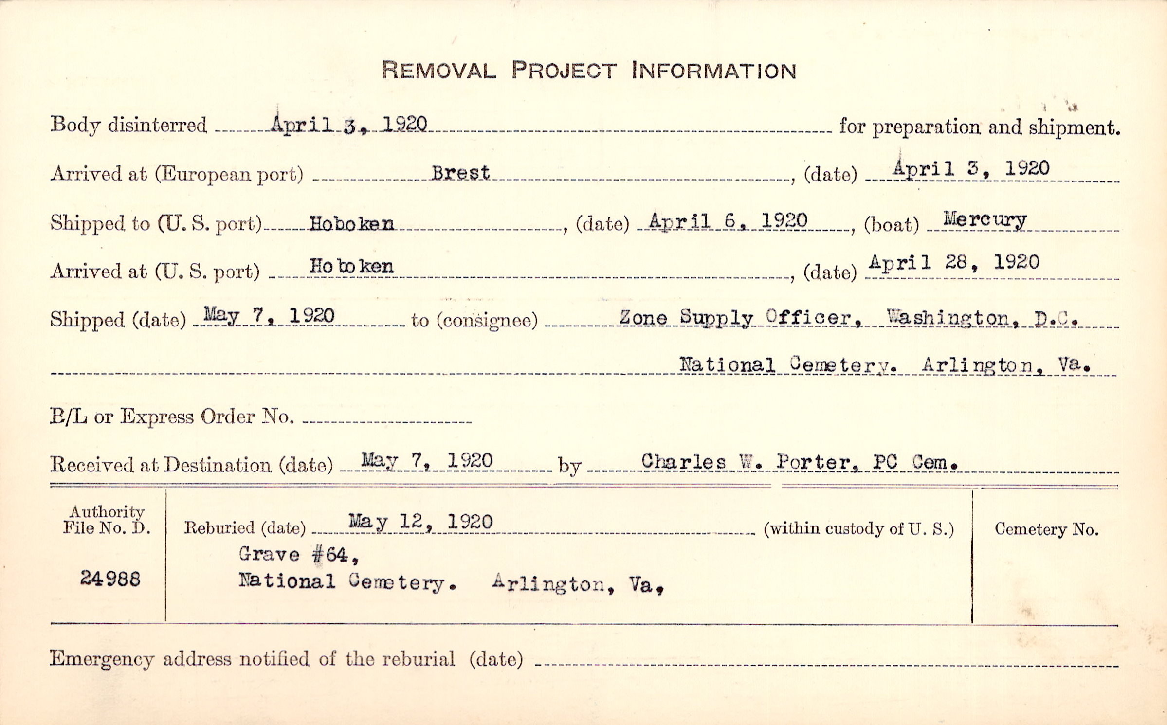 Body disinterred 4/3/1920 for preparation and shipment.