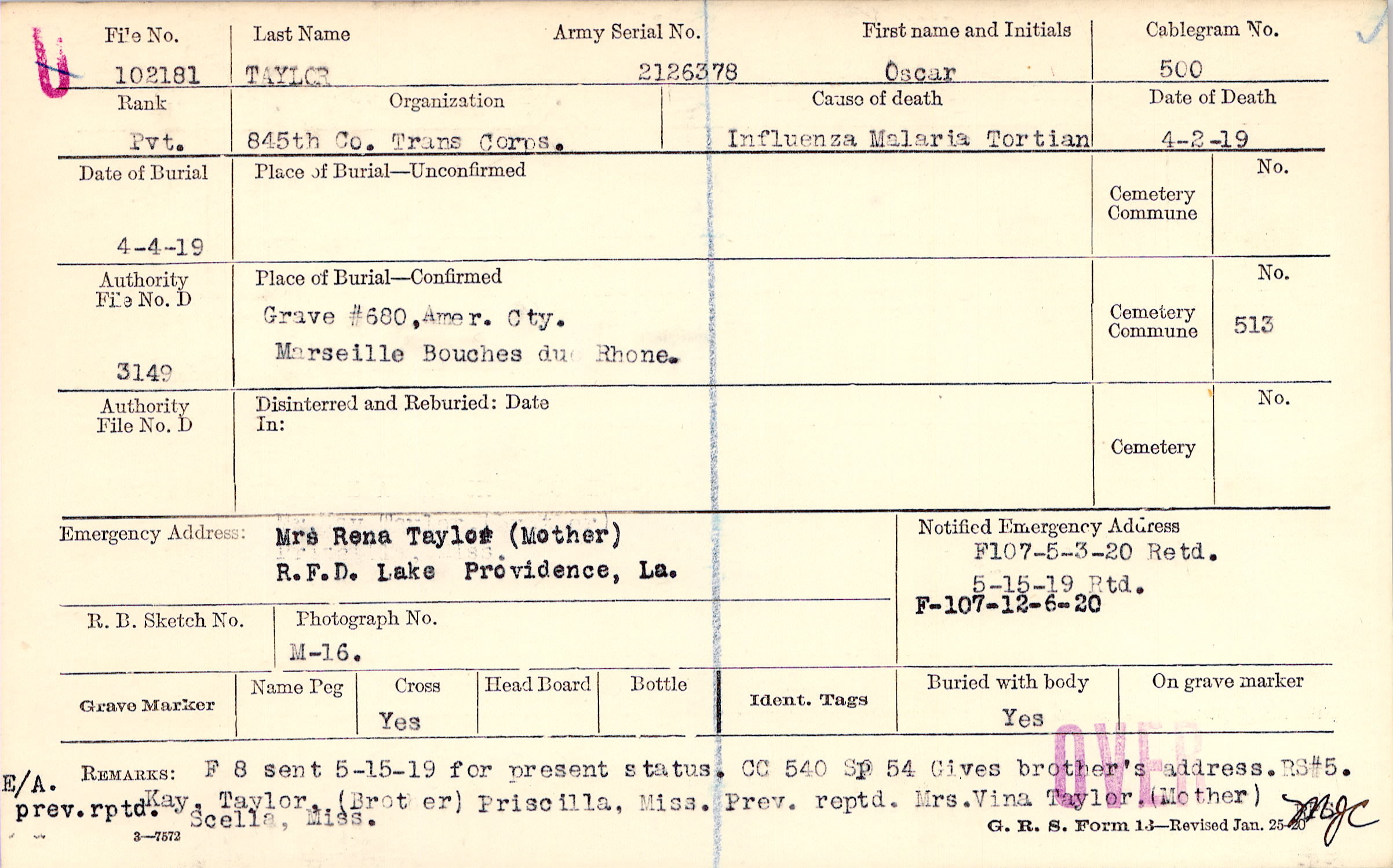 Mrs Rena Taylor (Mother), R.F.D. Lake Providence, La.