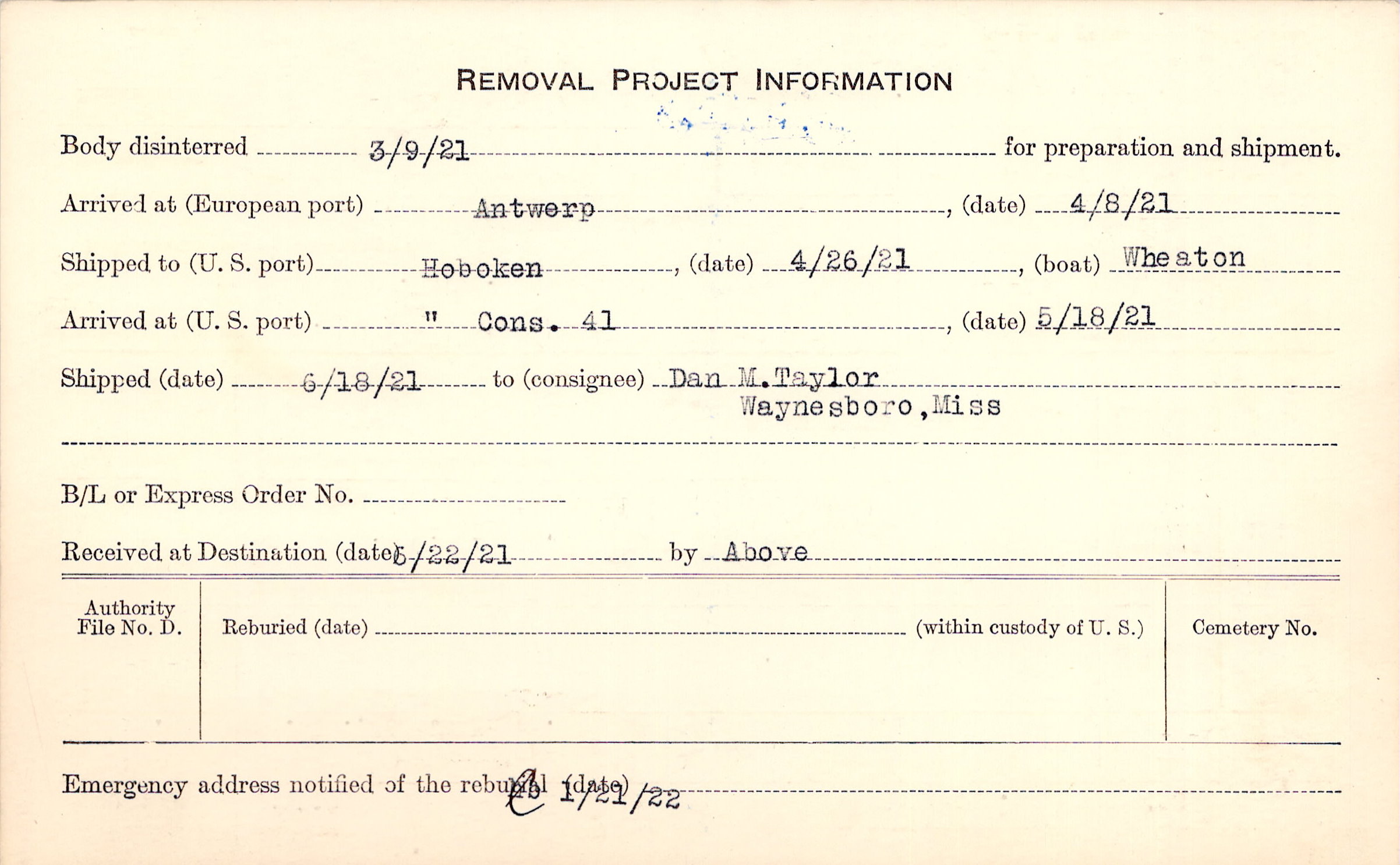 Body disinterred 3/9/1921 for preparation and shipment.