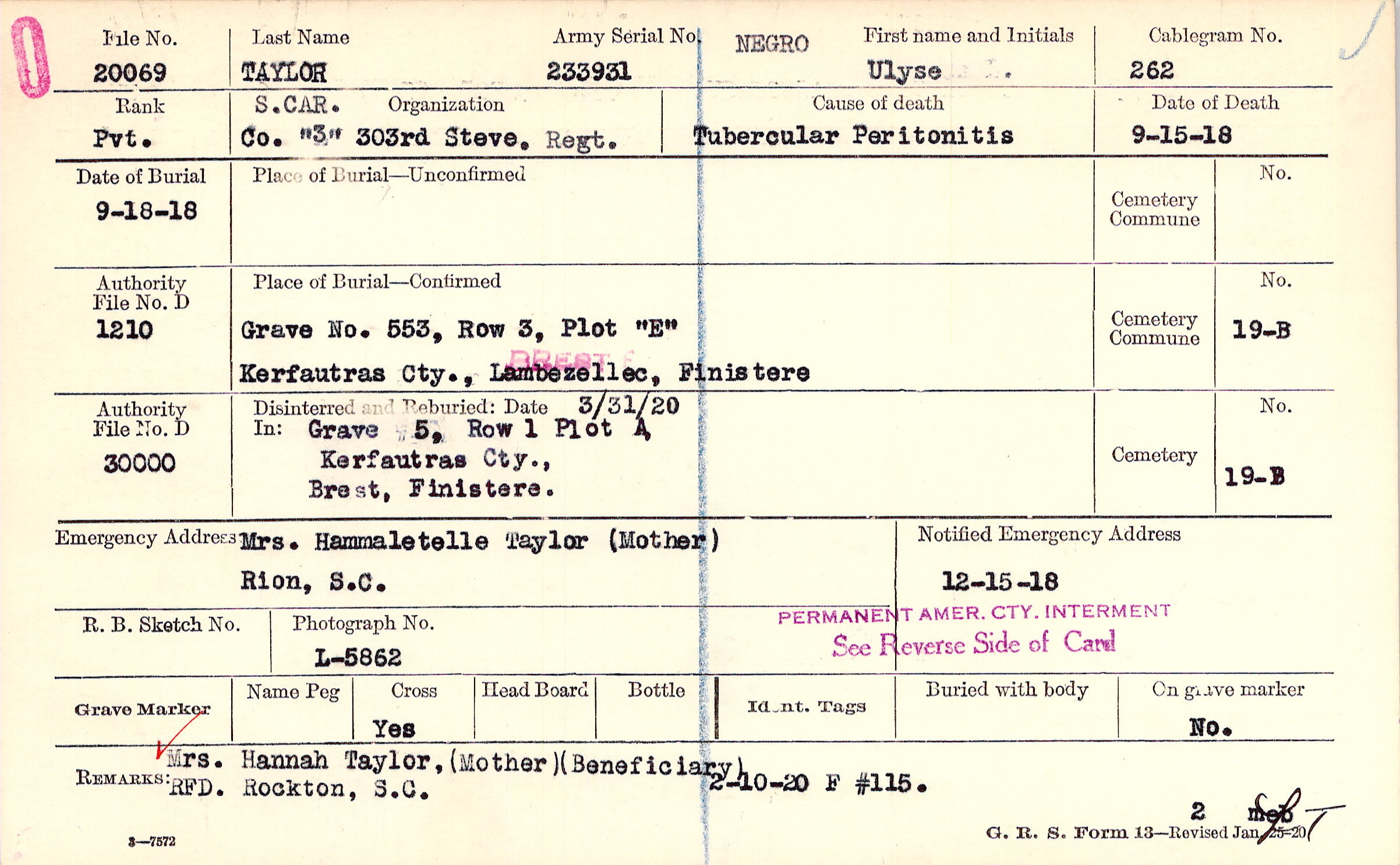 Mrs. Hannah Taylor, (Mother)(Beneficiary) RFD. Rockton, S.C., 2-10-20 F #115.