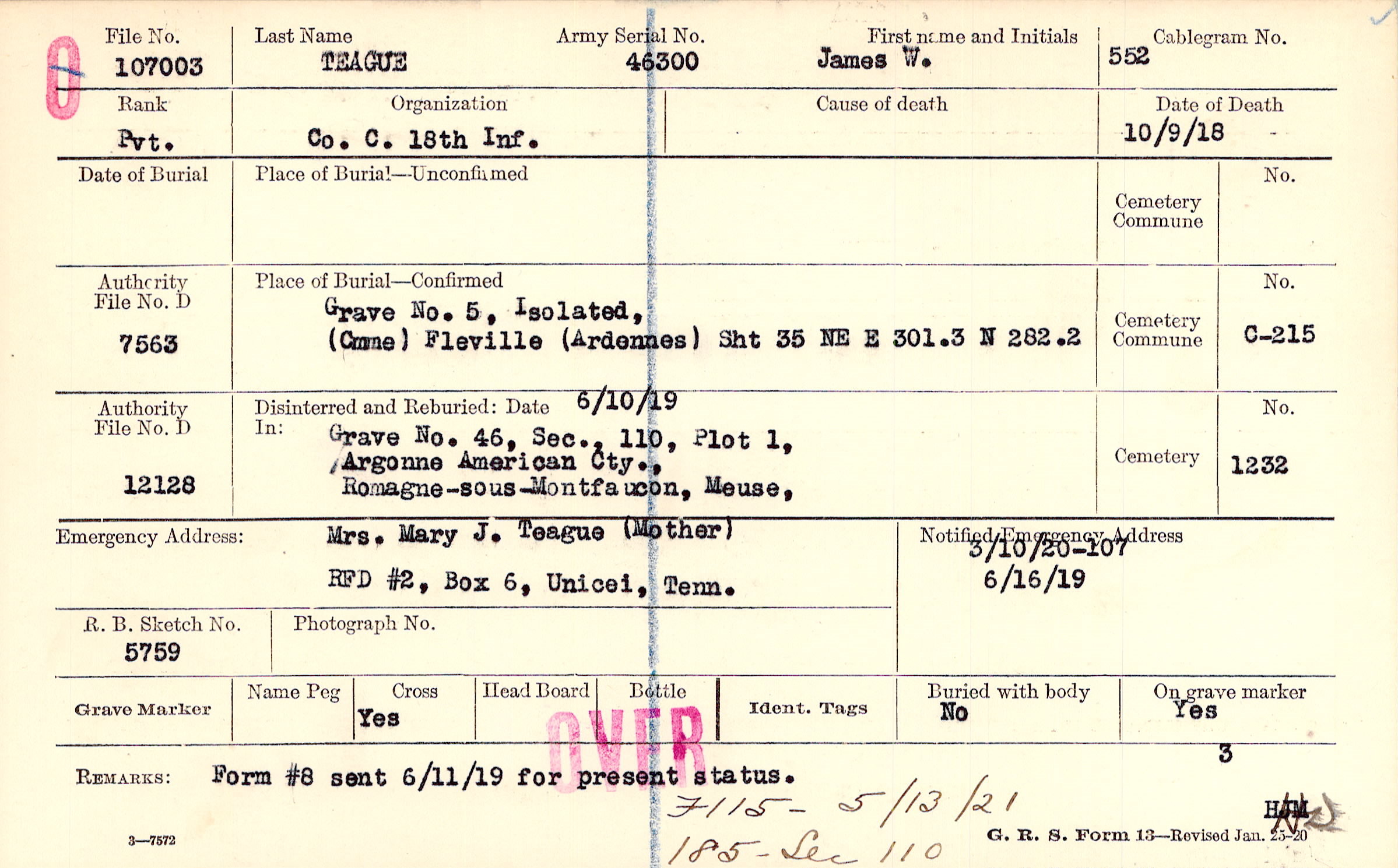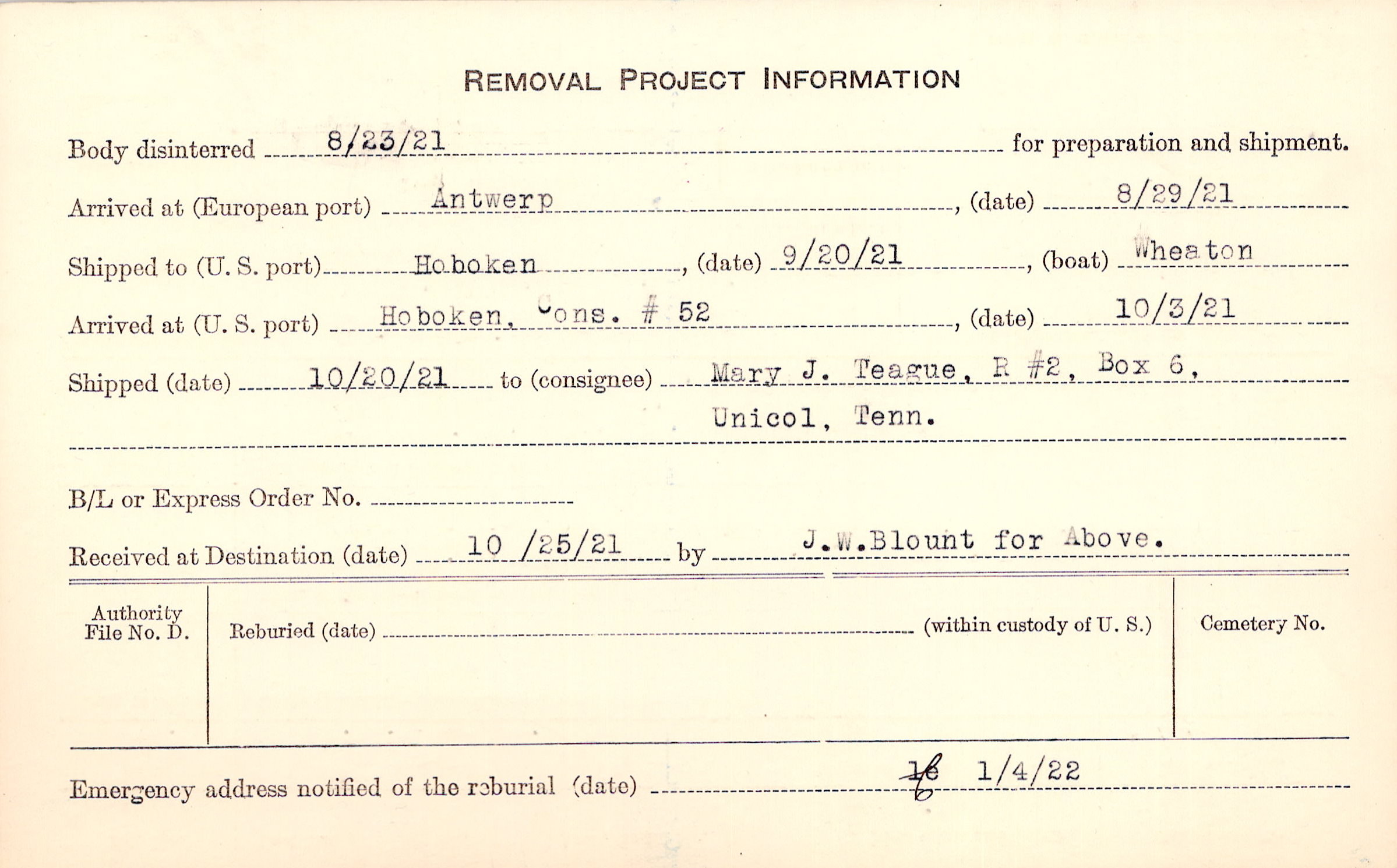 Mrs. Mary J. Teague (Mother), RFD #2, Box 6, Unicei, Tenn.