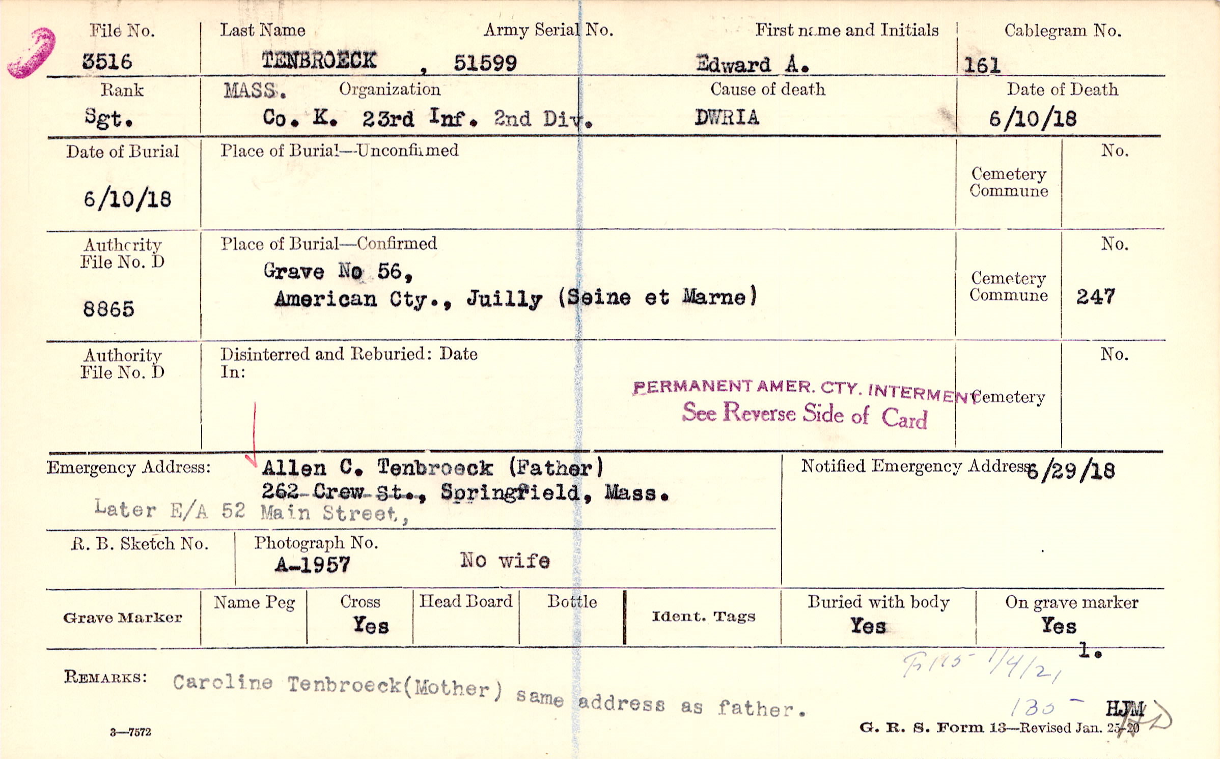 Allen C. Tenbroeck (Father), 262 Crew St., Springfield, Mass., Later E/A 52 Main Street, No wife