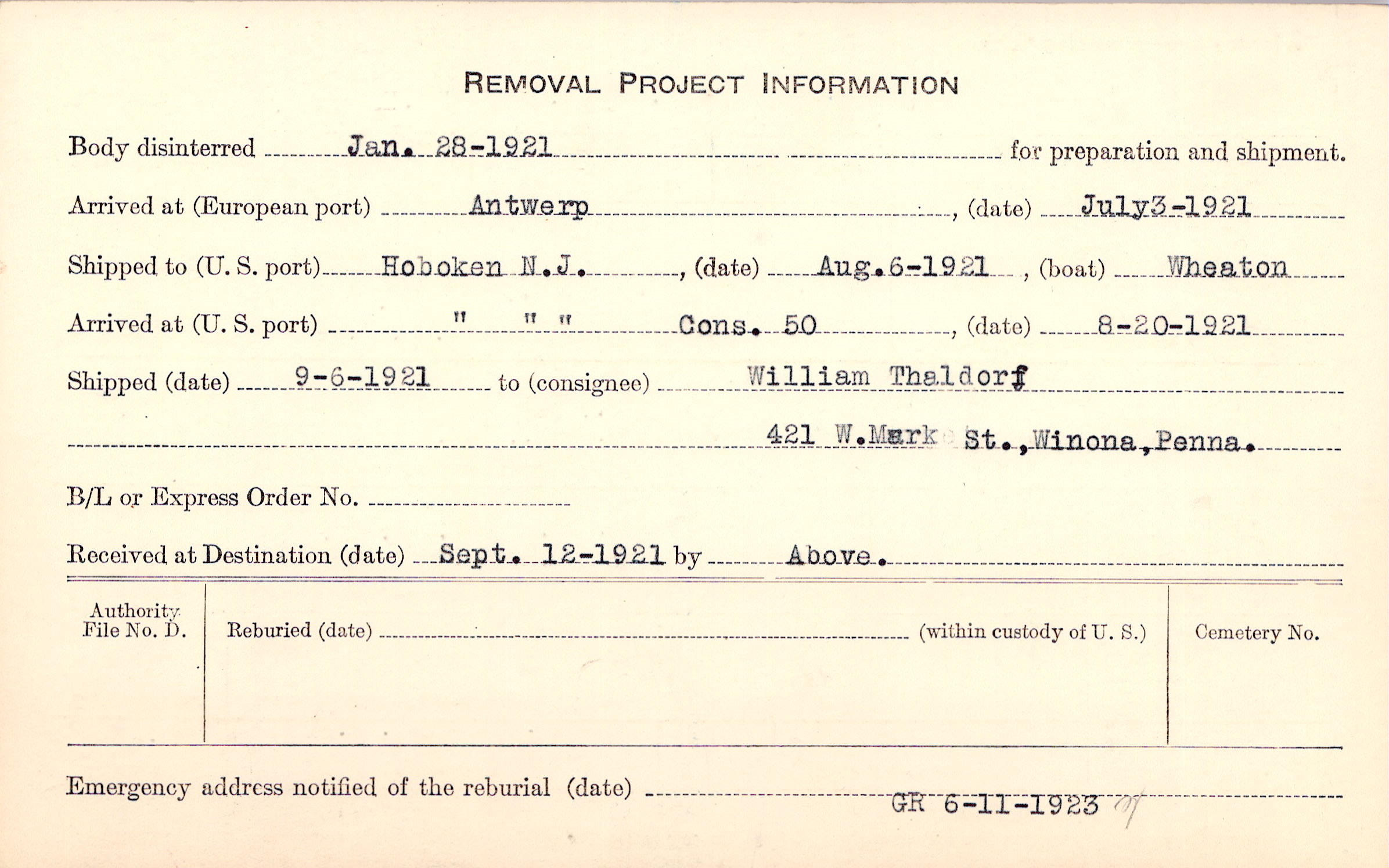 Body disinterred 1/28/1921 for preparation and shipment.