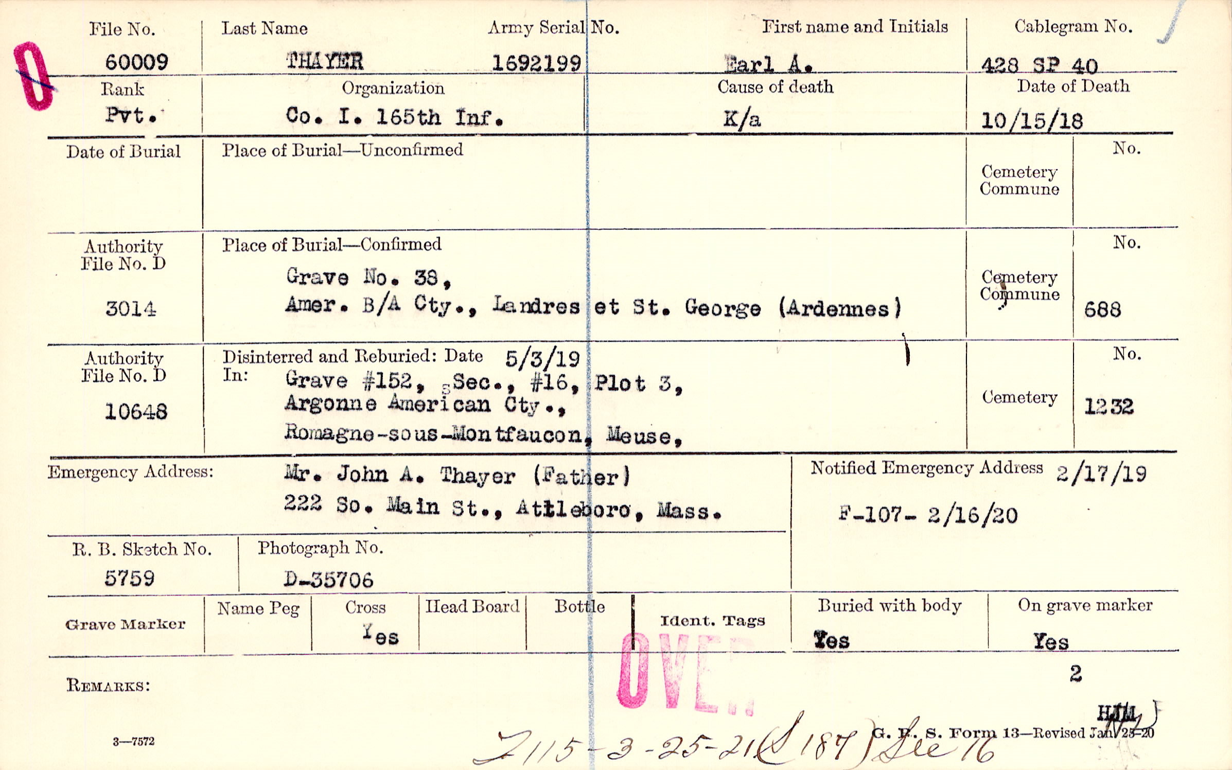 Mr. John A. Thayer (Father), 222 So. Main St., Attleboro, Mass.