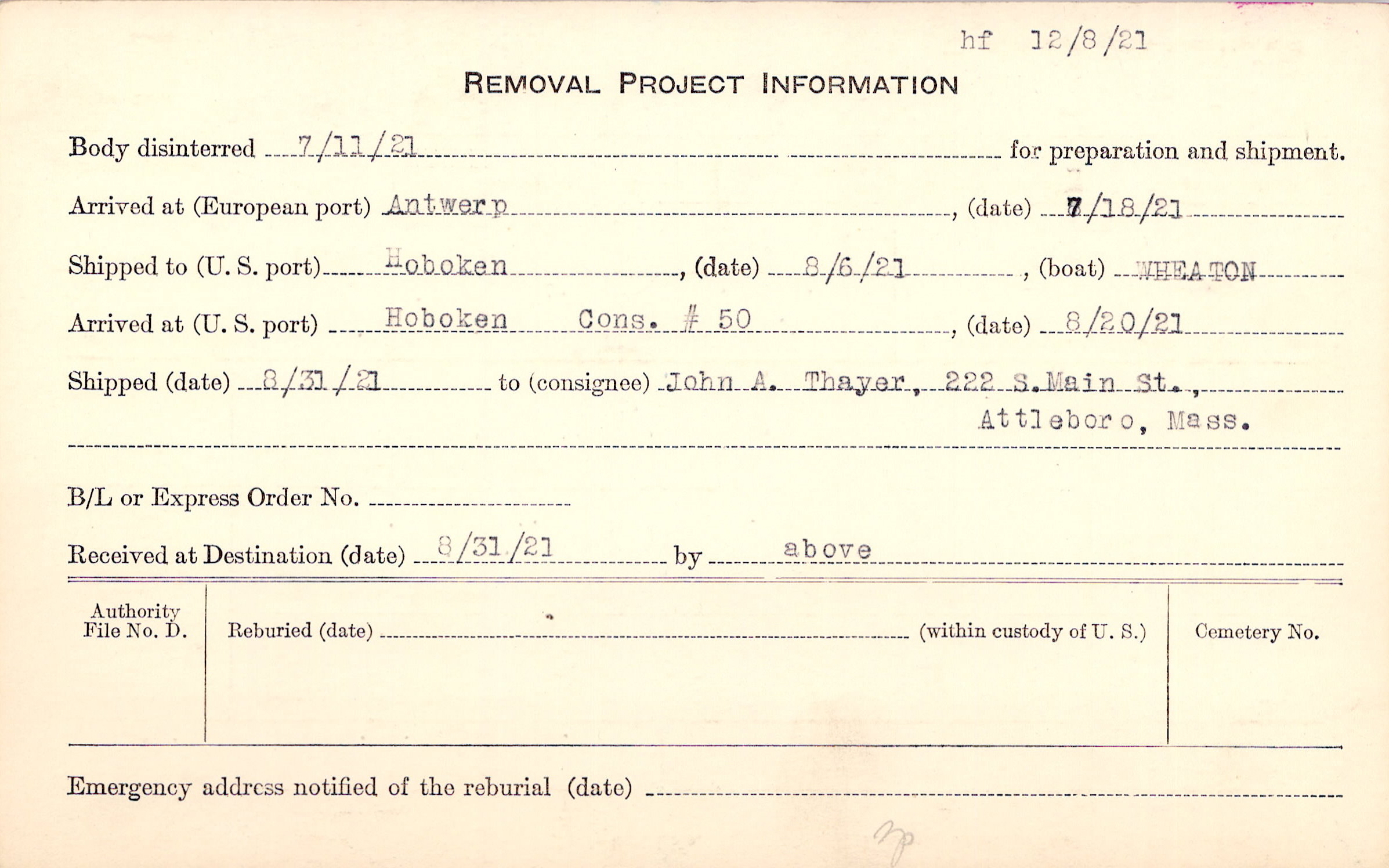 Body disinterred 7/11/1921 for preparation and shipment.