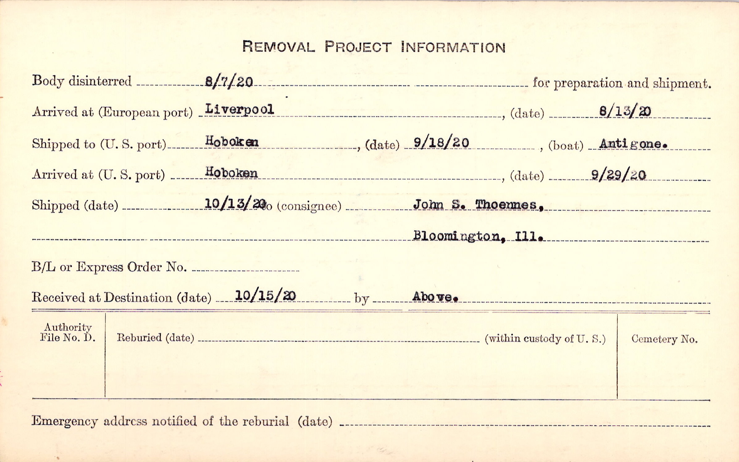 Body disinterred 8/7/1920 for preparation and shipment.