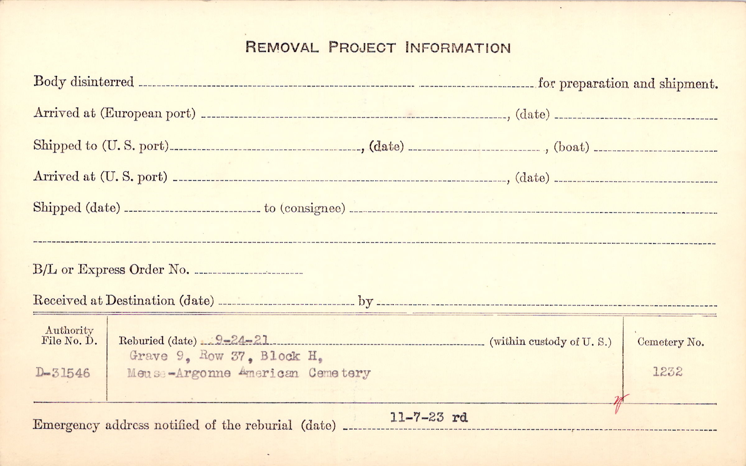| Permanent Burial in Foreign Cemetery |